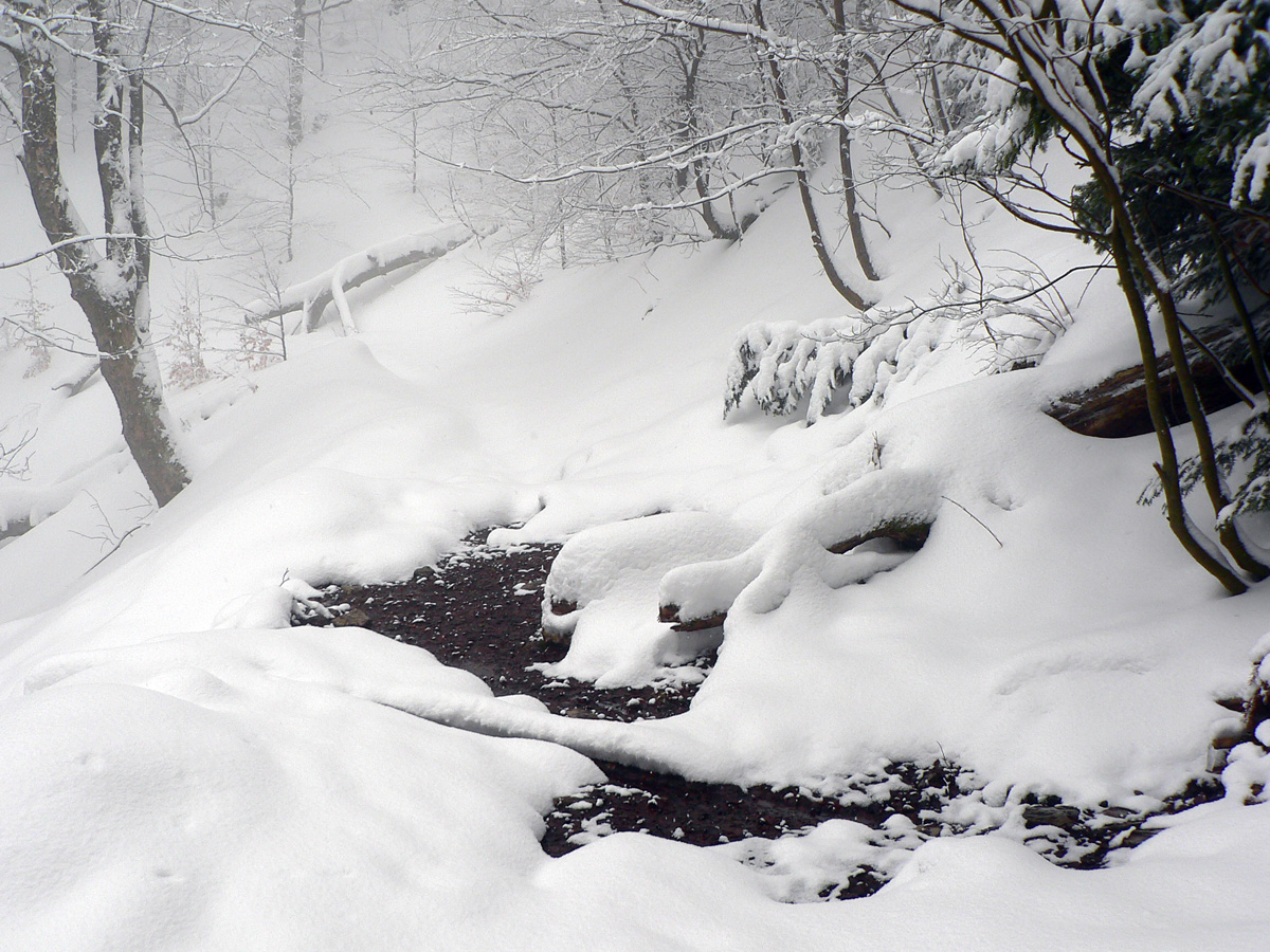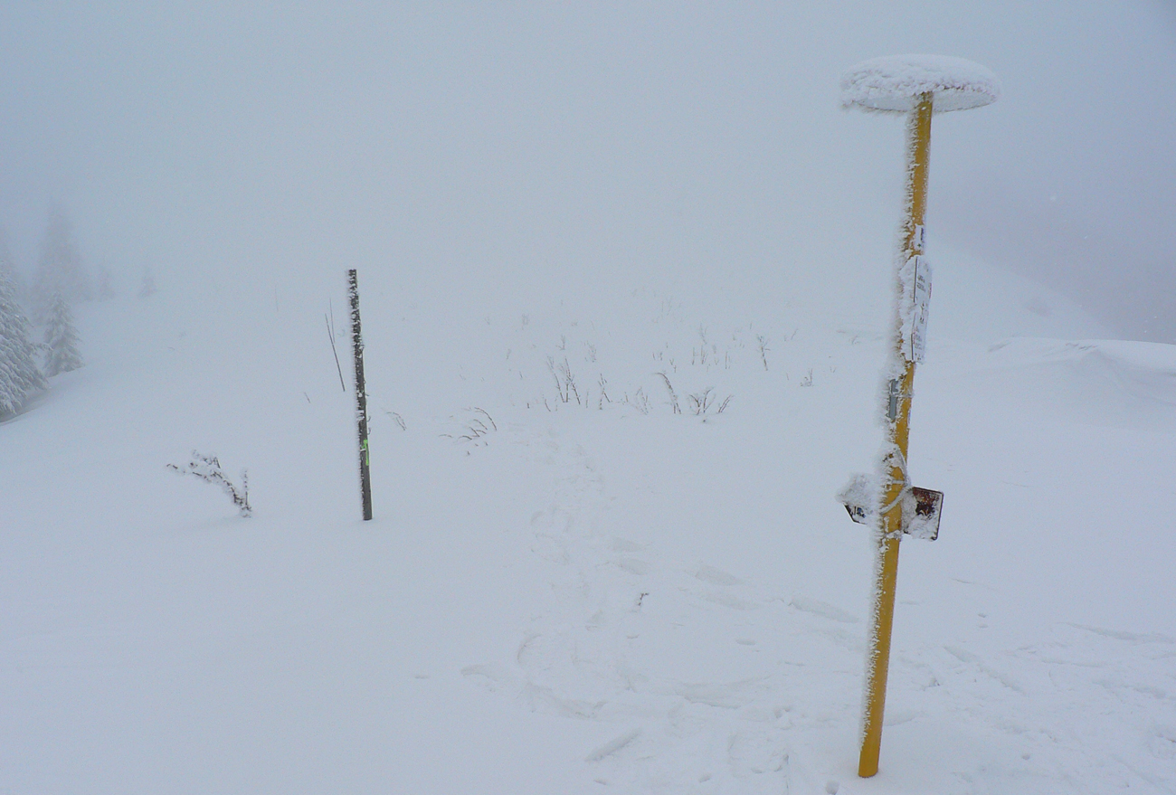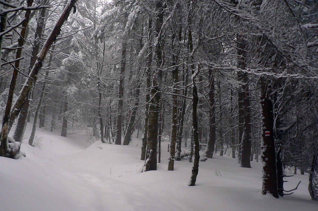 Hore nevidno ničovatô nič, tak cestou aspoň tyče obíjam, ale dáko ich je čoraz menej... Ale stôp požehnane, tak idem po nich. Intuitívne vnímam podľa sklonu terénu, kde asi som, ale že idem aj s tými stopami nejako moc prudko dole a že nejako priskoro som odbočil viac doprava, to mi dochádza, až keď vidím na strome pred sebou zelenú :-) Jáááj, ale do Brusna nechcem!!! Že bude viac stôp týmto smerom ako po hrebeňovke, to by mi veru nenapadlo.