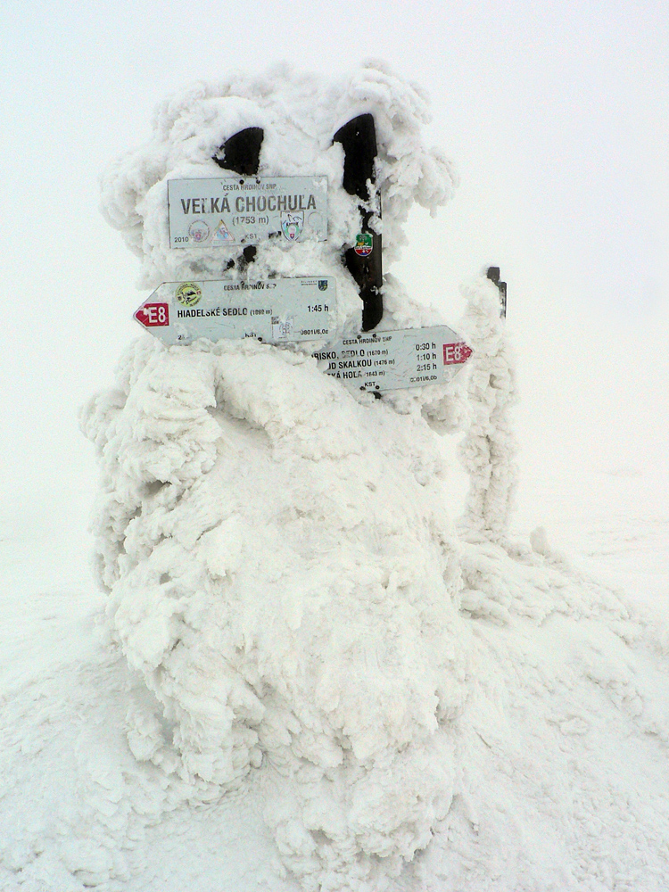 Tak nazad, polhodinka ma nezabije. Ale hore sa točím ako osa na cukríku a just neviem prísť na to, kde som. Asi pod Veľkou Chochuľou, tam niekde tá zelená odbočuje do doliny! No ale že žiadne stopy, to sa divím. A ani tyče... Tak intuitívne, ponad preveje na hrane hrebeňa (aj keď ich ledva vidno), veď tam musím trafiť!!! A ako na zavolanie: dvaja chlapi na snežniciach, a že idú z Lúžnej. Ufff, tak stopu mám :-)