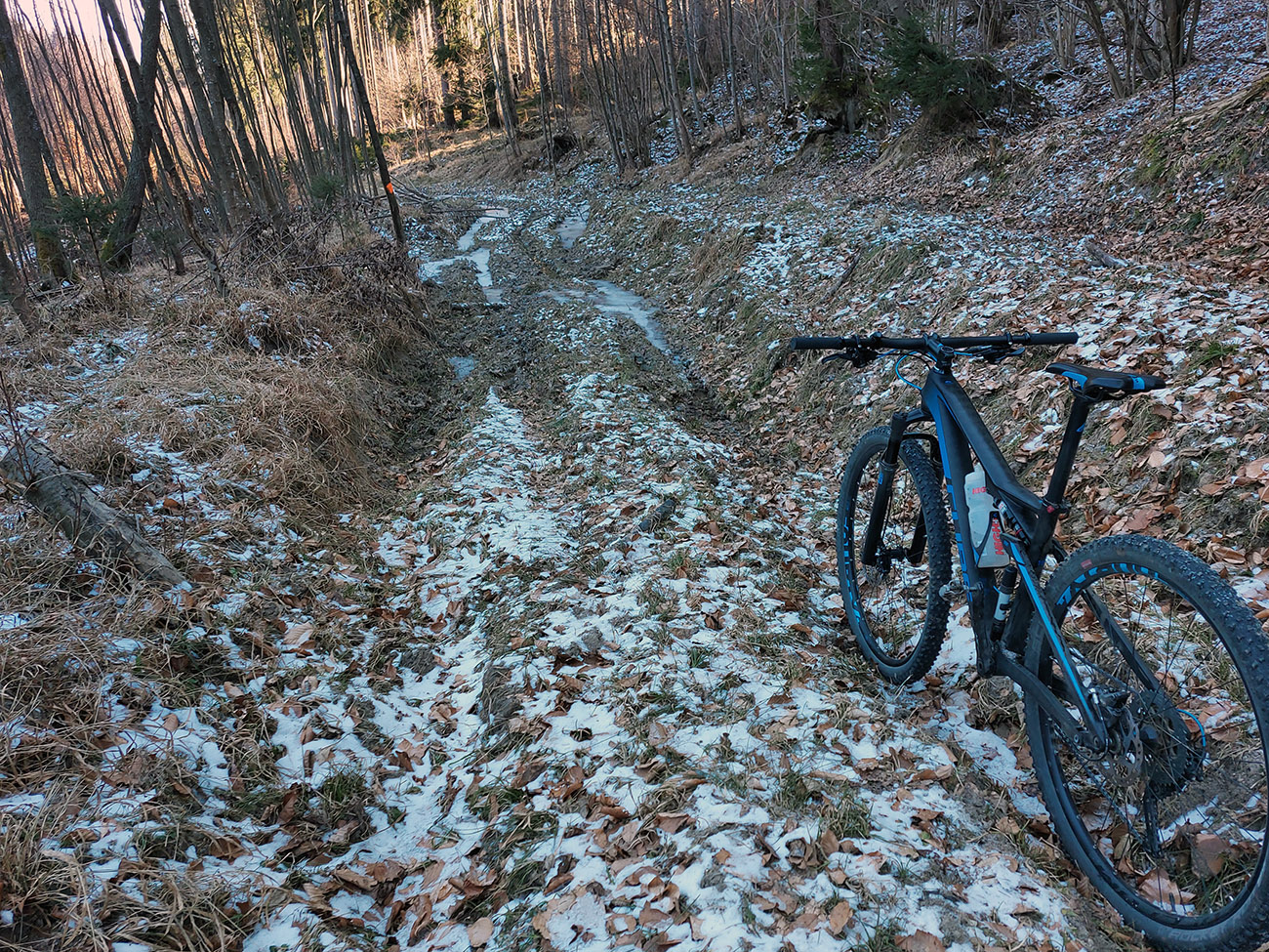 Tankodrom som pri návrate vzal zhora, oslovila ma cesta do lesa, sľubujúca obchádzku jedného neslušne strmého úseku. Ale bola neslušne rozjazdená traktormi, koľaje vyplnené ľadom, a jej záver ani neexistuje – zarástol spolu s rúbaniskom. Tak som sa strmine popri strelnici nevyhol. Ale krátka bola.