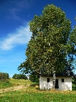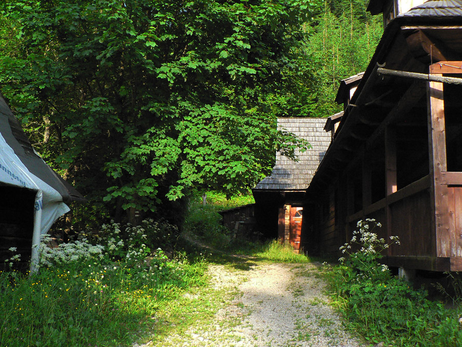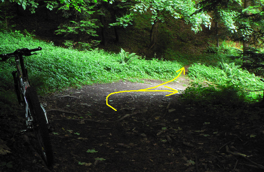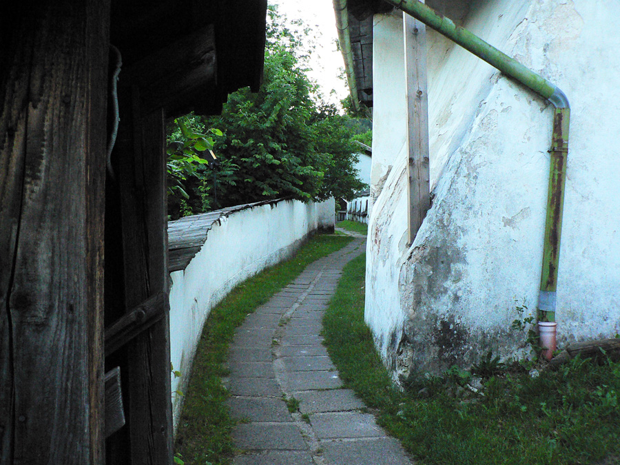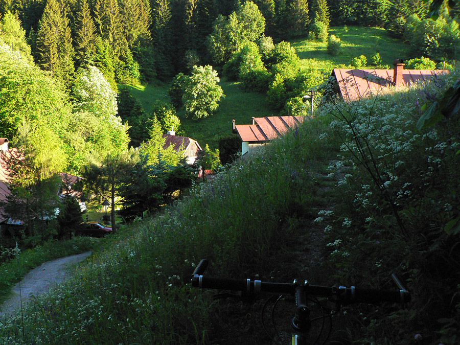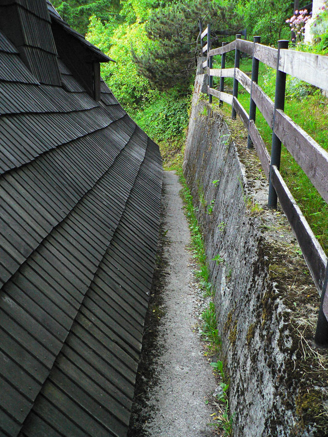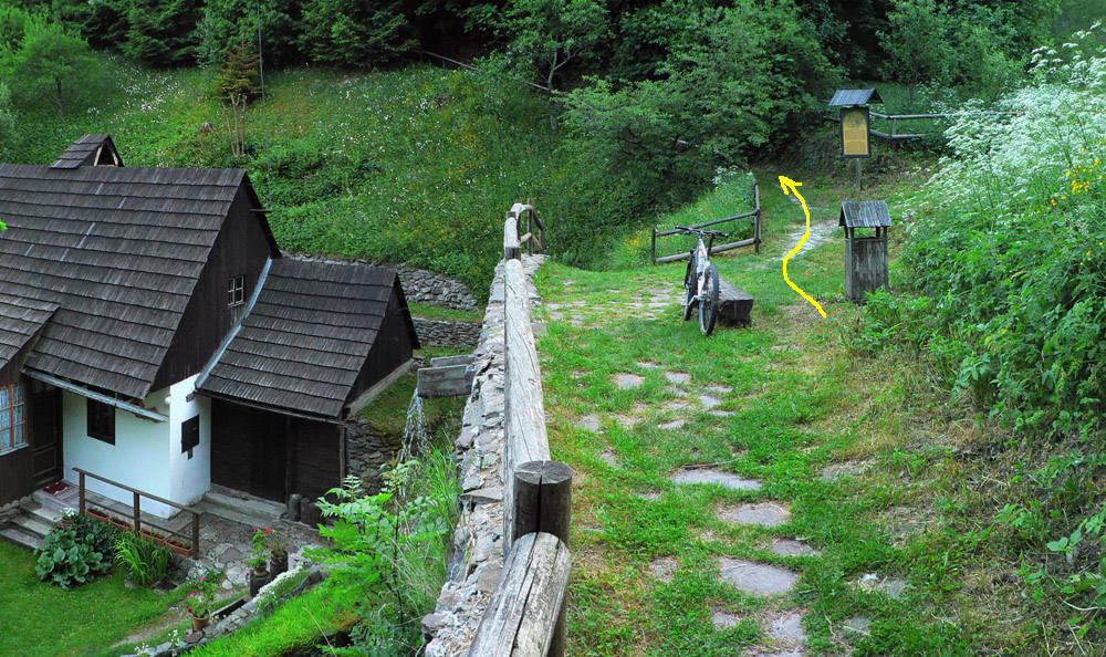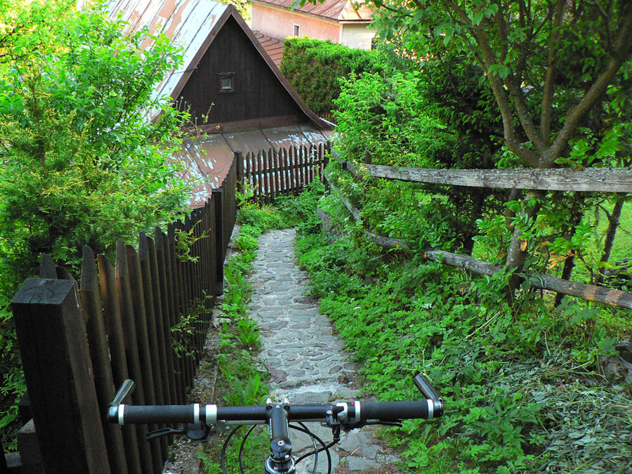 Lebo chodník sa tesne nad prvými domami rozdvojí: vľavo do dediny, ale ja točím vpravo popod haldu a uzučkými chodníkmi pomedzi domy. Krása je to, ale opatrne! Vždy sa môže niekto vynoriť oproti a domáci sa boja o šindle na strechách, nemajú asi bajky moc radi. Ešte úzky tunel krovinami a som na plošinke pri tajchu banského vodovodu.