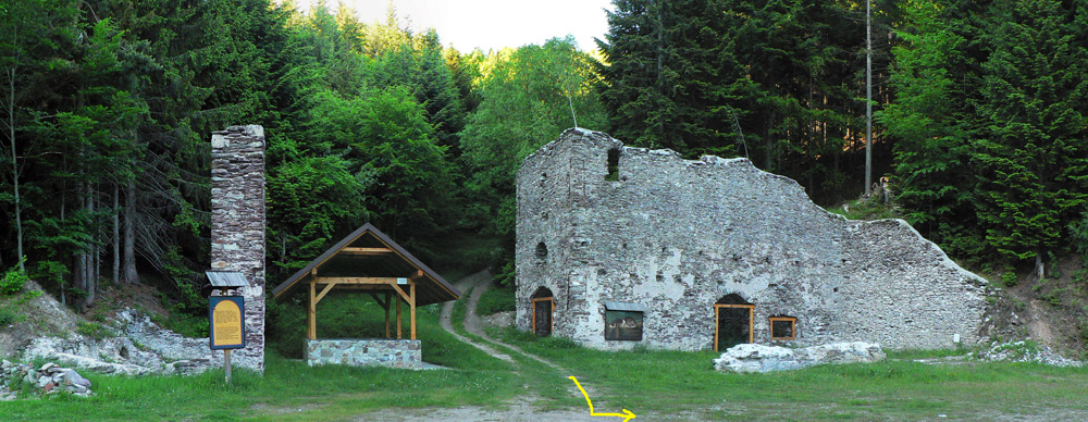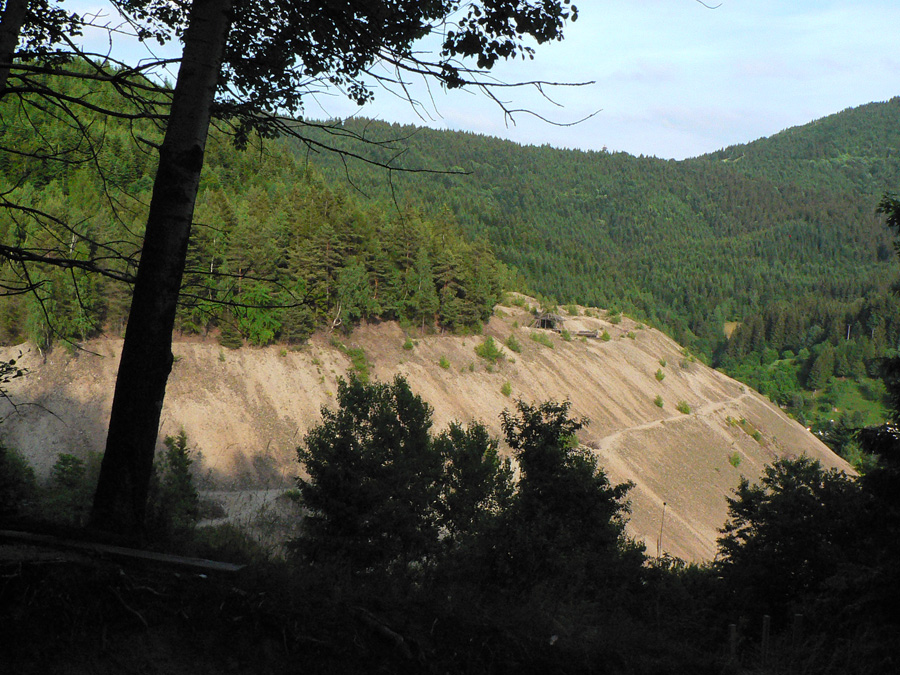 Pár serpentín, z lúk prvé sporé výhľady na dedinu. Sklon sa stráca, „pochrtím si“ dva – tri kiláky takmer po rovine, aby som celú dedinu obišiel, a keď pod cestou začnú v lese presvitať ruiny šachty Ludovika, po chvíli k nim odbočujem prudko dole doľava. Šachta bola v tejto oblasti suverénne najhlbšia (400m).