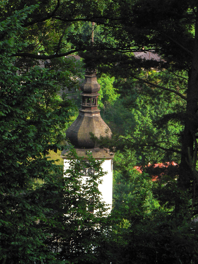 Ďalej po modrej značke: ešte trochu po lesnej ceste, na horný koniec dediny. Jednoduché. Cestou pomedzi konáre preblesknú dominanty dediny: veža kostola a halda šachty Maximilián, ktorá sa týči nad dedinou a je z nej najlepší výhľad. K nemu mierim. Líznem areálik šachty s banskými vozíkmi a mením modrú za červenú popri vyparádených dreveniciach.