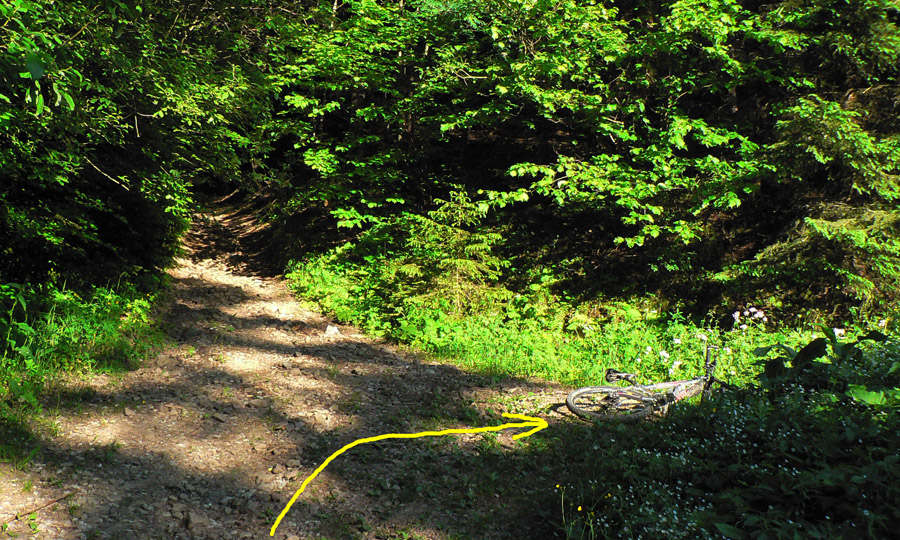 Kúsok strmšej kamenitej cesty a odbočka doprava na chodník ponad haldu. Skoro hneď je tu aj odbočka k vyhliadke: je to to najtypickejšie z pohľadov na Španiu Dolinu. Dole na bajku, pokochám sa výhľadom, nazad na chodník vytlačím. Cestou ďalej míňam ešte jednu odbočku k halde a keď sa chodník stočí dole k dedine, minie štôlňu Mann a začína tá pravá zábava!