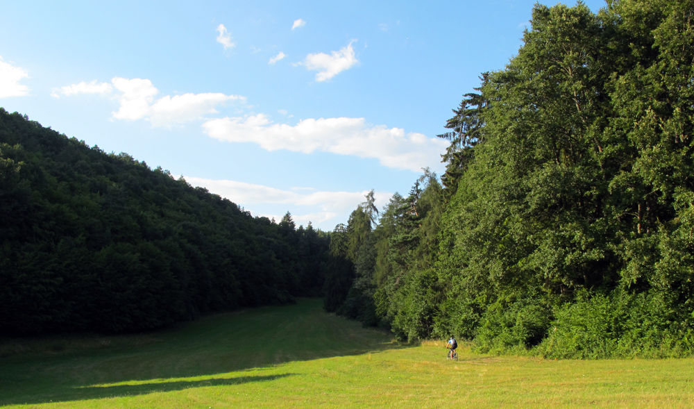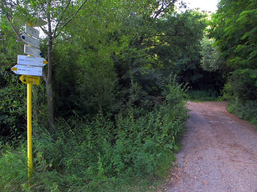 Serpentínka doľava, križovatka poľných ciest, a to už mierime zas na sever, nazad k Hornej Mičinej. Na úvod okrajom poľa, dole asfaltkou, na jej konci po lúkach k lesu. Tam je to trochu neprehľadné, lebo na lúkach žiadna cesta, len jemné stopy po autách a je ich viac. Treba pohľadať najdlhší „lúčny“ záliv do lesa, na jeho konci potom už lesom vedie cesta, do kopca.