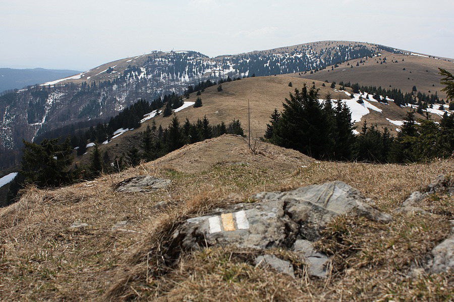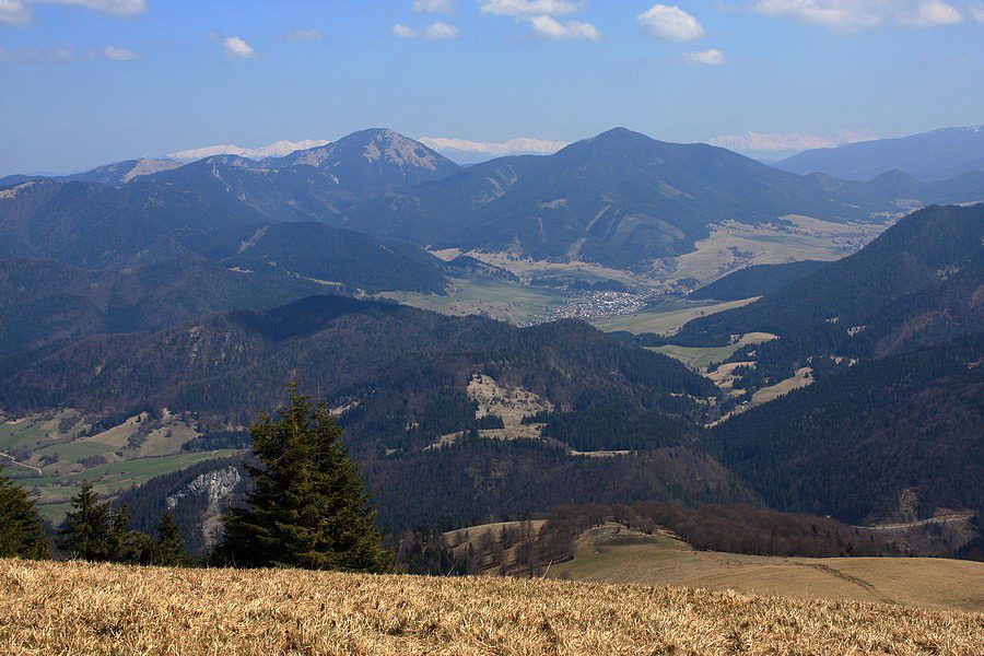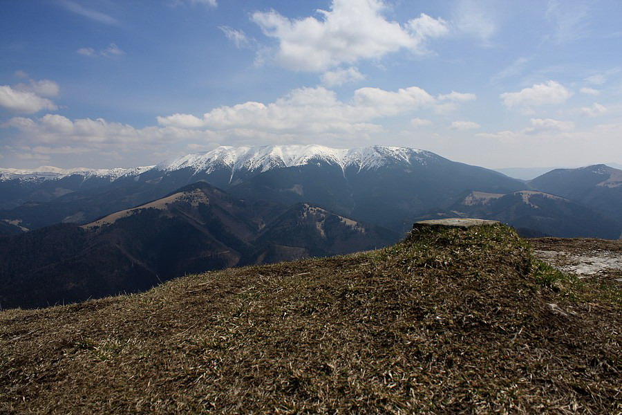 Autobus ma vypľúva na zastávke v Nižnej Revúcej. Viem, že ma čaká niečo cez 800 metrov prevýšenia a skúmajúc zvyšné vystupujúce osadenstvo mi je jasné, že si okrem zvýšenej tepovej frekvencie užijem aj ticho a samotu. Vykročím svižne po žltej značke. To tempo ma však veľmi rýchlo prejde, keď po pár desiatkach metrov chodník prudko odbočí pomedzi domy. Šinie si to priamo k lyžiarskym vlekom a hybaj ho hore zjazdovkou. Odmenou za vypľuté pľúca sú ale krásne výhľady na veľkofatranský hrebeň od Rakytova cez Čierny kameň až po Krížnu. Aj v tomto ročnom období zjazdovka žije svojím životom. Všade sú milióny fialových kvietkov - asi to bude šafran :o) Na vrchole zjazdovky ticho vďačím za chabý tieň medzi konármi stromov. V letných horúčavách by ma na túto trasu nikto nenahovoril. Takmer celá vedie lúčinatým a hôľnym terénom. Slušný predpoklad na uvarenie mozgu natvrdo. Na Malý Zvolen je to už čo by kameňom dohodil. Trochu pomedzi stromy a cez osirelé snehové políčka (ktoré sa drzo tlačia do topánok), trochu trávnatým hrebienkom a som hore. Neviem, či mám najskôr fotiť kruhové výhľady alebo kvetinky. Z fototranzu ma preberie iba bodľačina, do ktorej si nevedomky líham. Ešte zbodnem sváču a vyrážam ďalej.
