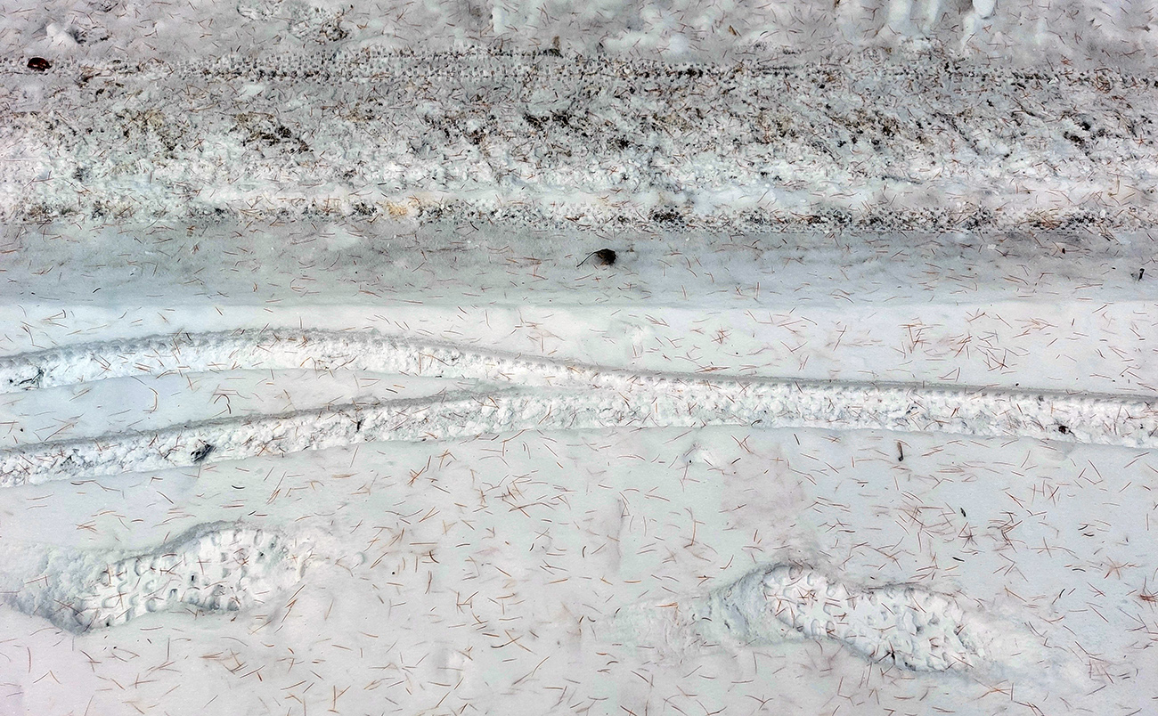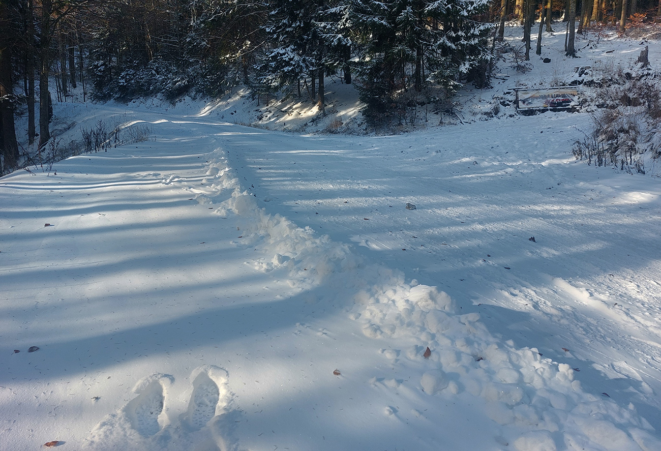 Pod Kalužnou: odtiaľ by sa dalo „od parkoviska“. Asfaltka odhrnutá, ujazdená, dalo by sa po pevnej bielej vrstve komfortne hore a opatrne hádam aj dole, isto aspoň po nižšie parkovisko pri Studničke..