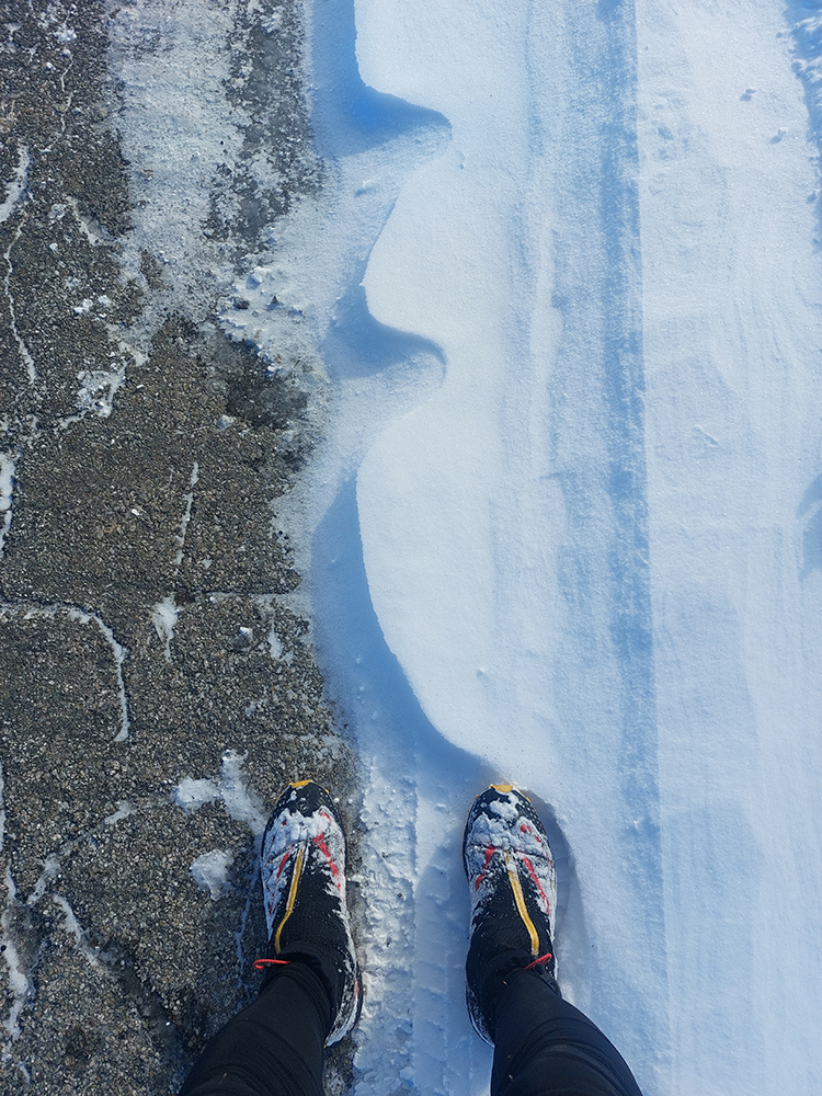 Po Medvedej ceste by sa opatrne na pásoch dalo mooožno aj od Investičky, takých 5 cm na zamrznutej hline, stredom to ide. Ale lepšie furt na bajku. Popri padaní aj fúkalo, tak tesne pred napojením na serpentíny viac tej hliny.