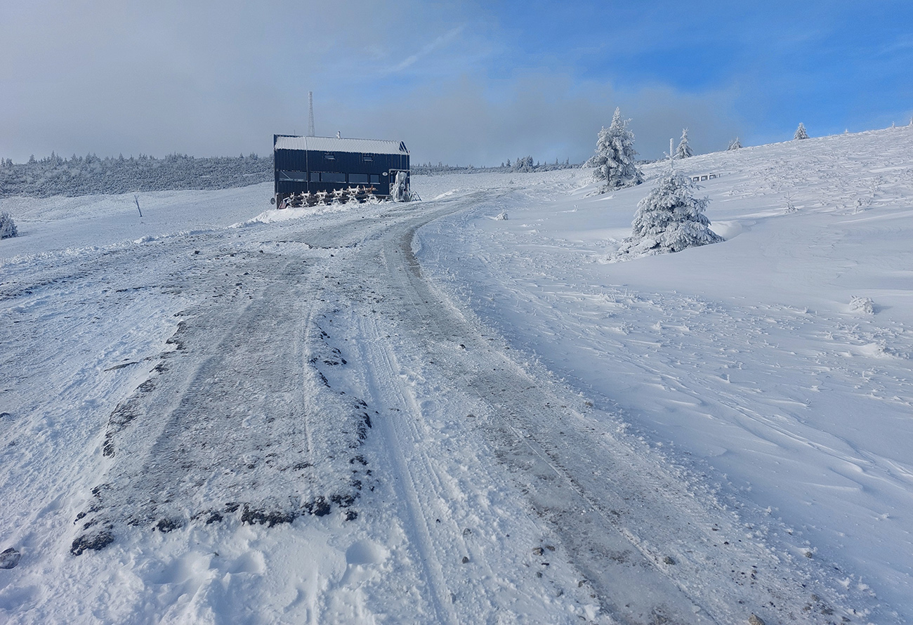 Okolo starej chaty je už vidieť, že viac fúkalo ako snežilo, aj asfalty trčia na zákrute a trávy kde kade. Aj tam platí, že hore pistou by to išlo, dole aj kameňáky škoda drať. Zato cesta od chaty až hore k vysielaču čistý pásový komfort, ak si odmyslíme vyfúkaných pár metrov pod chatou Javorina (dá sa to obísť).