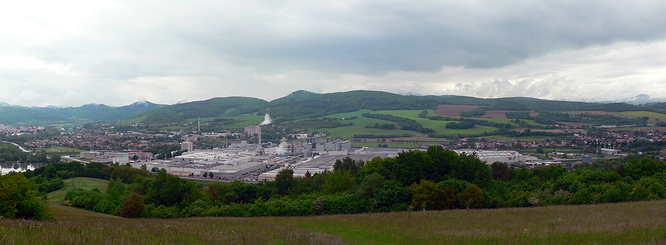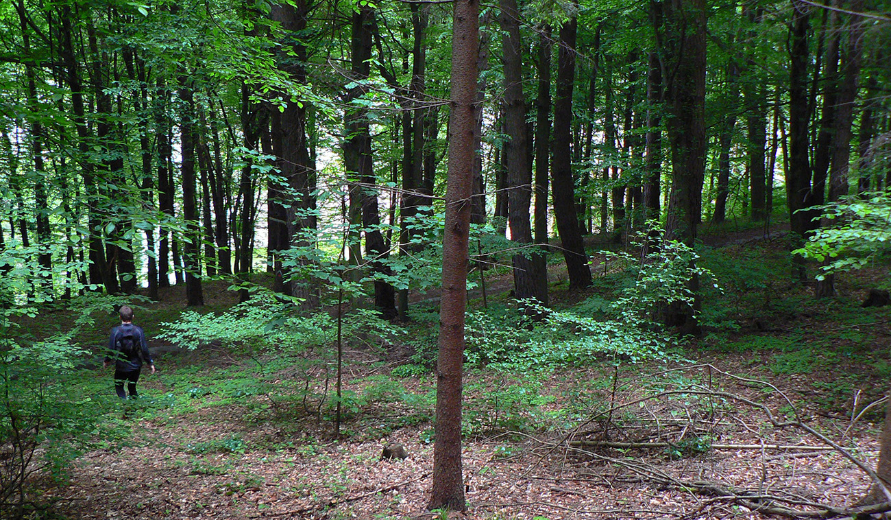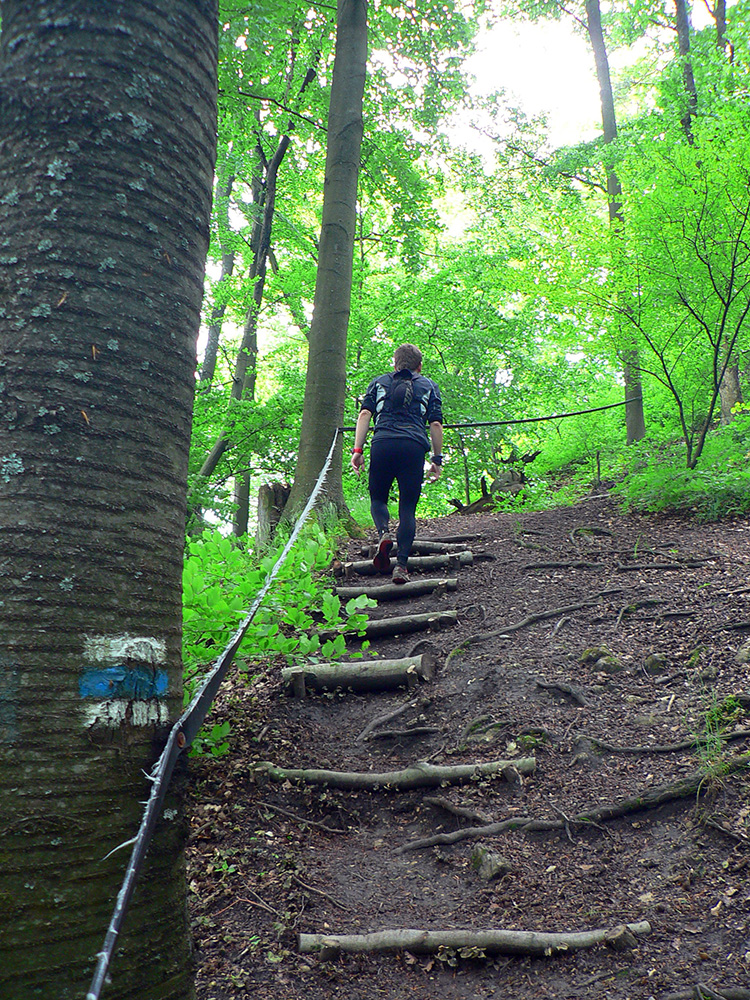 Cez Hradisko a Kozinec potom už furt lesom. Na Hradisku ozaj zvyšky hradiska a aj tabuľa, za Kozincom zase krásny, jemne klesavý singlík sviežim zeleným lesom. Ten nás ale nenechá dlho užívať si, vypúšťa nás na klasickej zvážnici a už nám to čvachtá. A ešte viac to čvachtá a na podrážky sa lepí, keď cesta vylezie z lesa na lúky a klesá do Nových Nosíc medzi domy. Pred nami Púchov skoro v celej svojej kráse, dnes ho ešte uvidíme aj lepšie a najmä zo všetkých strán. Tak zatiaľ z východu: