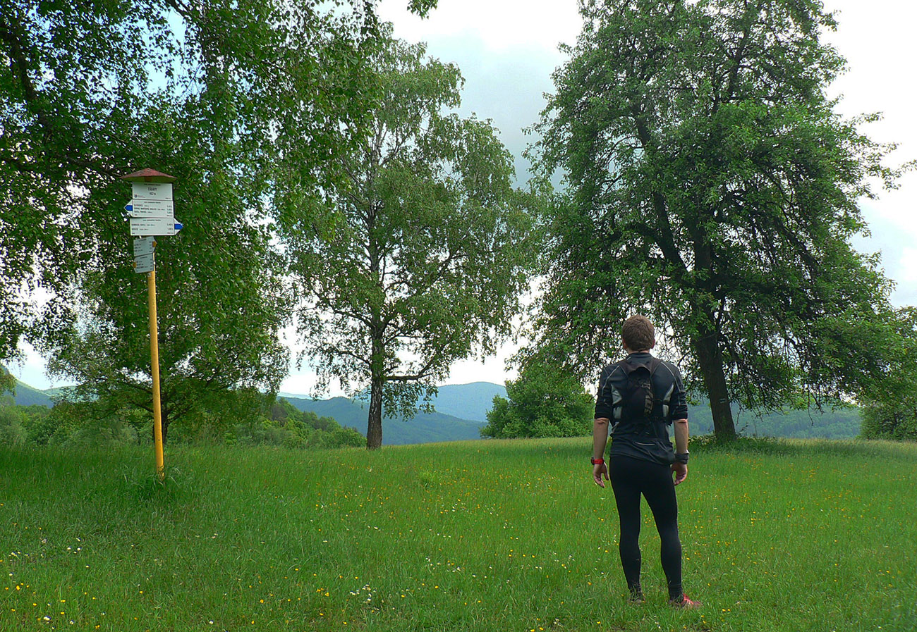 Ideme na to: na úvod je na výber dlhšie a miernejšie alebo kratšie a strmšie zvážnicové stúpanie k výhľadu od bývalej hvezdárne na Hviezde. Berieme prvú možnosť. Prší už len zo stromov, blata je dosť, ale na lúkach ho vysoká tráva rýchlo stiera. Doma potom zistíme, či sa aj kliešťov urodilo. Zašedivený výhľad z Hviezdy na priehradu s kúpeľmi na jednom brehu a Milochovom na druhom, ale „hory už fajčia“, hádam už bude naozaj po daždi. Aj mraky sa pomerne rýchlo dvíhajú, aj keď sú stále poriadne „olovené“ - ale špicaté Klapy sme pred chvíľou ešte nevideli.