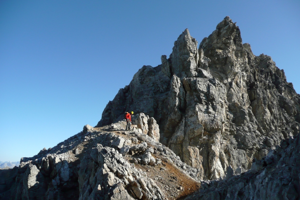 Od Payerhütte vedie cesta vpravo od hrebeňa rozbitým terénom. Náročnejšie výšvihy sú zaistené reťazami. V najstrmšom úseku, kde reťaze vedú takmer kolmou stenou sa aj cvakáme o reťaz cez slučku. Čisto pre istotu. Kvôli voľným kameňom je dobré mať aj prilbu.