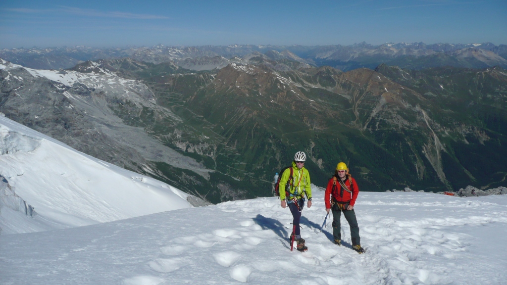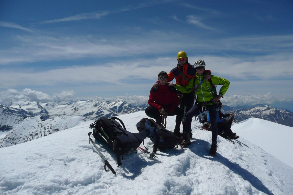 Potom to bolo už len šliapanie v úžasnej páľave hore miernym svahom. Prechádzame aj popri dvoch naozaj veľkých trhlinách. Niečo po dvanástej sme na vrchole. Takže zo Suldenu 7 a pol hodiny s prestávkami. Martinove 4 hodiny sú naozaj brutálny čas. Ale som spokojný, lebo ešte včera večer som vravel, že ak nevyjdeme do dvanástej obeda, tak to otáčame. Na vrchole je to veľké Slovensko-České stretnutie, keď mnohí práve doliezajú Hintergrat.
