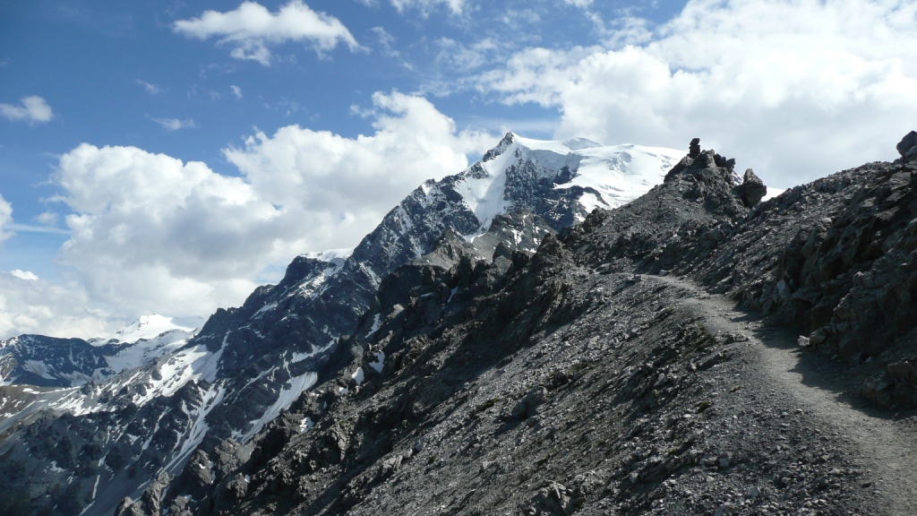 Pobolieva ma koleno a zastávky a najmä tá na Taberettahütte to len zhoršujú. Medzi chatami prichádza kvôli tomu kolenu kríza a napadá mi, že tam dnes ani nevyleziem. Azda prvýkrát v živote ma takto bolí koleno. Len nesmiem zastavovať, lebo potom bolí viac. Na Payerhütte sme o 7.15. Moje časové plány vychádzajú s odchýlkou do 5 minút. Odkedy sme na hrebeni, výhľady sú parádne. Nikde ani mráčka, Wildspitze, jazerá pri Passo Ressia a hlavne pohľad na cestu na Passo Stelvio je super. Rozoznávame aj MTB chuťovku Goldseeweg, užívame si krásny deň na správnom mieste.