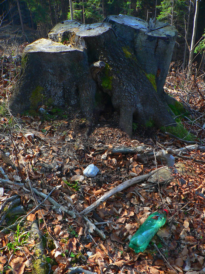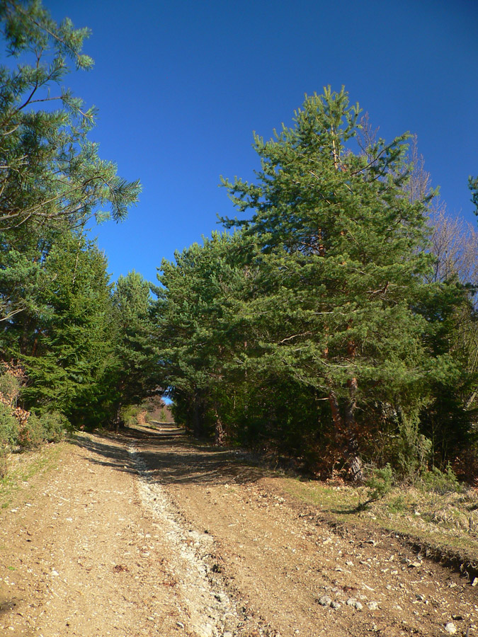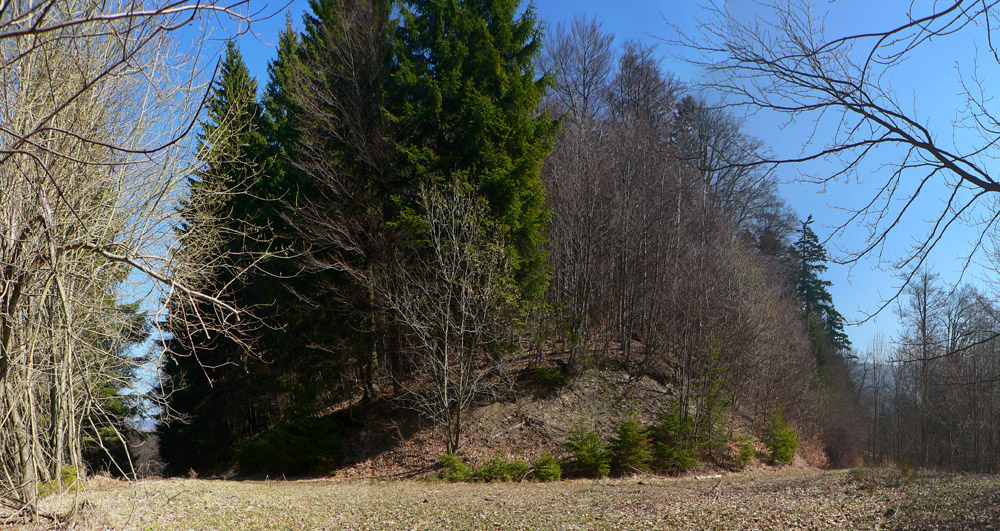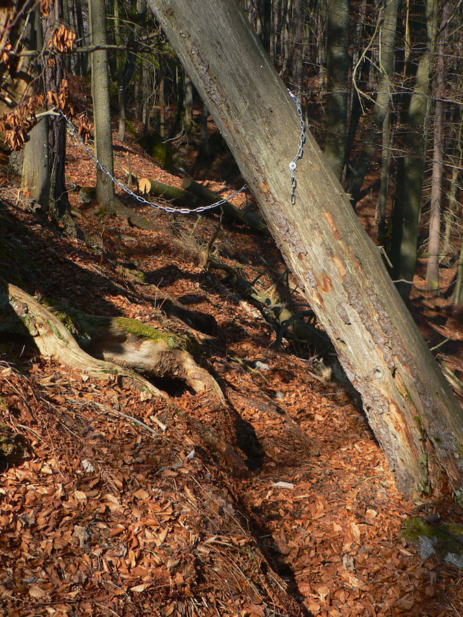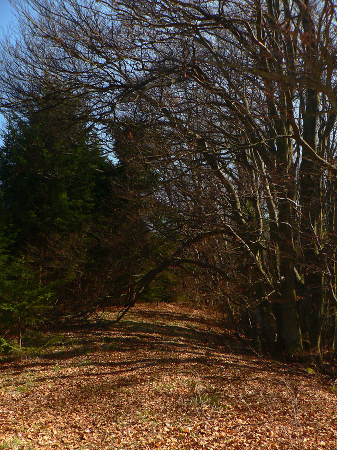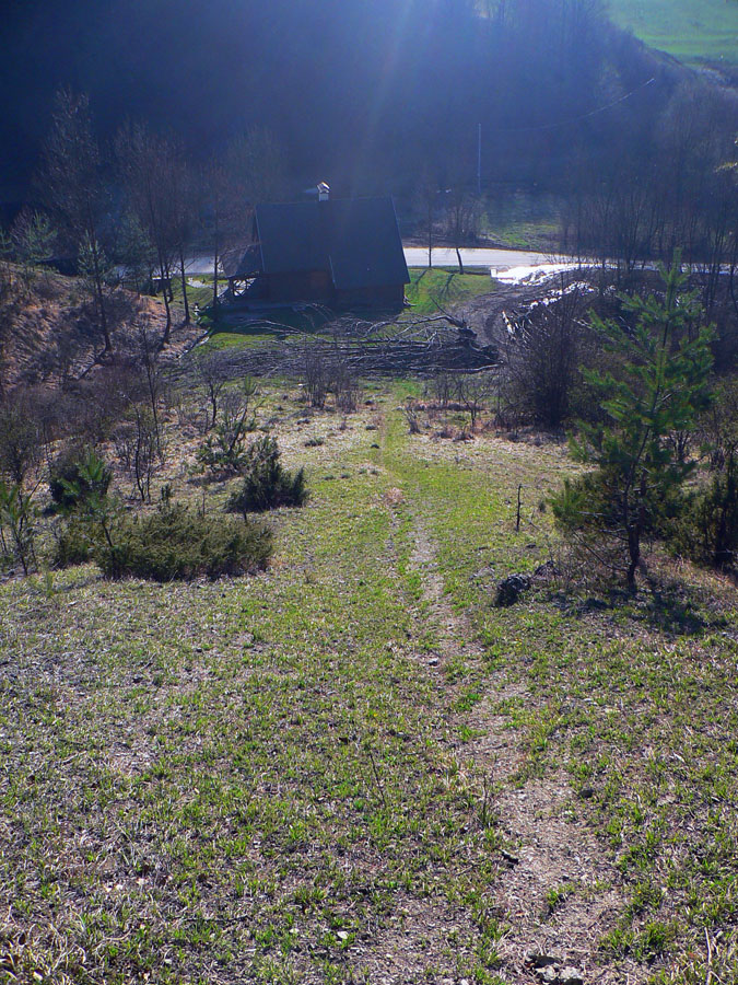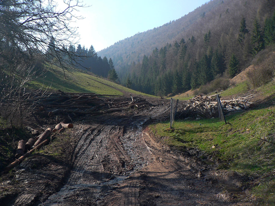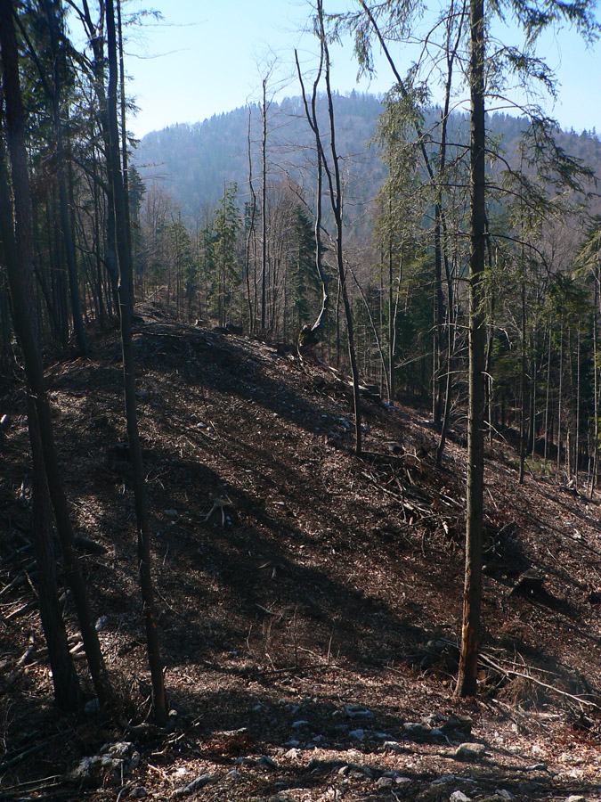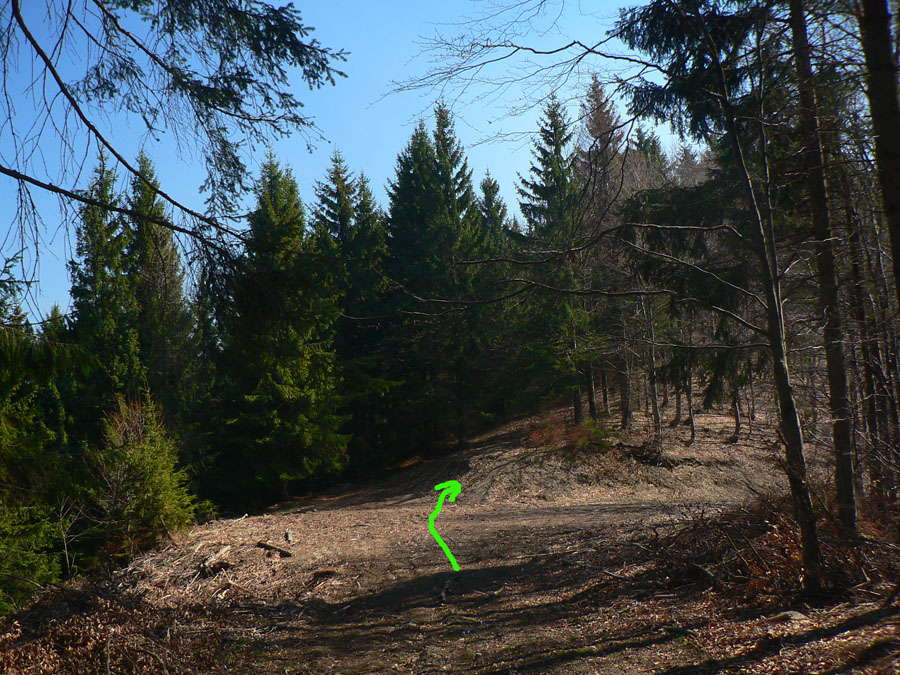 Na konci série rúbanísk vedie krížom cez náš hrebeň chodník - stúpa sem sprava zo záveru Hradskej doliny a klesá doľava na lúky nad Hlavnou dolinou. Za touto „križovatkou“ nasleduje široký priesek lesom a hrebeň sa pomaly odkláňa na východ, doľava od Prieložnice (1079m), ktorá bola doteraz priamo vpredu. Na konci prieseku v malom sedielku sa treba prebojovať cez popílené konáre, ale na severnom svahu hneď pod hrebeňom je zvážnica. Vedie správnym smerom, ale dá sa aj ponad ňu lesom. O chvíľu vylezie do sedielka s drevoskladom, z neho sa odkloní doprava do traverzu (klesá do Kantora), ale náš hrebienok pokračuje priamo, zase výrazným priesekom.