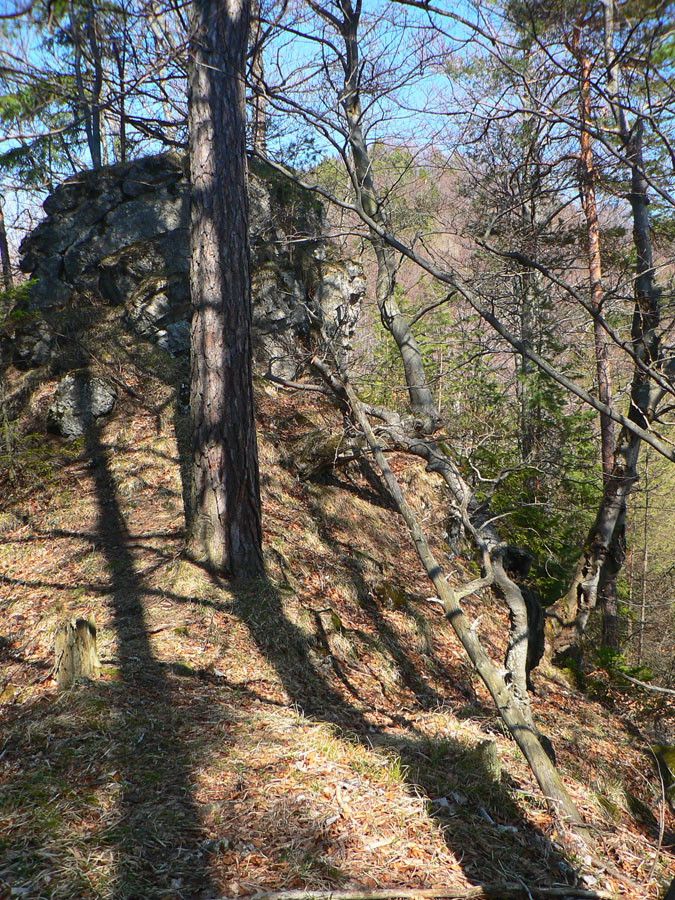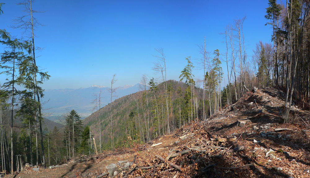 Hrebienok je najprv úzky, krásne bralnatý, chodník sa kľukatí pomedzi skaly. Dominujú borovice a sem-tam sa objavia výhľady na východ. Keď sa terén zaguľatí, hneď je tu sprava rúbanisko až dole po cestu v Hradskej doline, ale aj spätný pohľad na Krivánsku Fatru a na kopec s hradom. A všade bordel po pilčíkoch - prasce sú to, čo už s nimi?