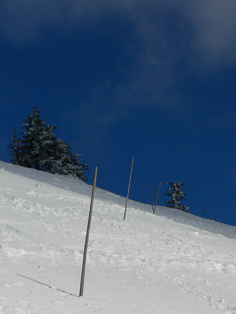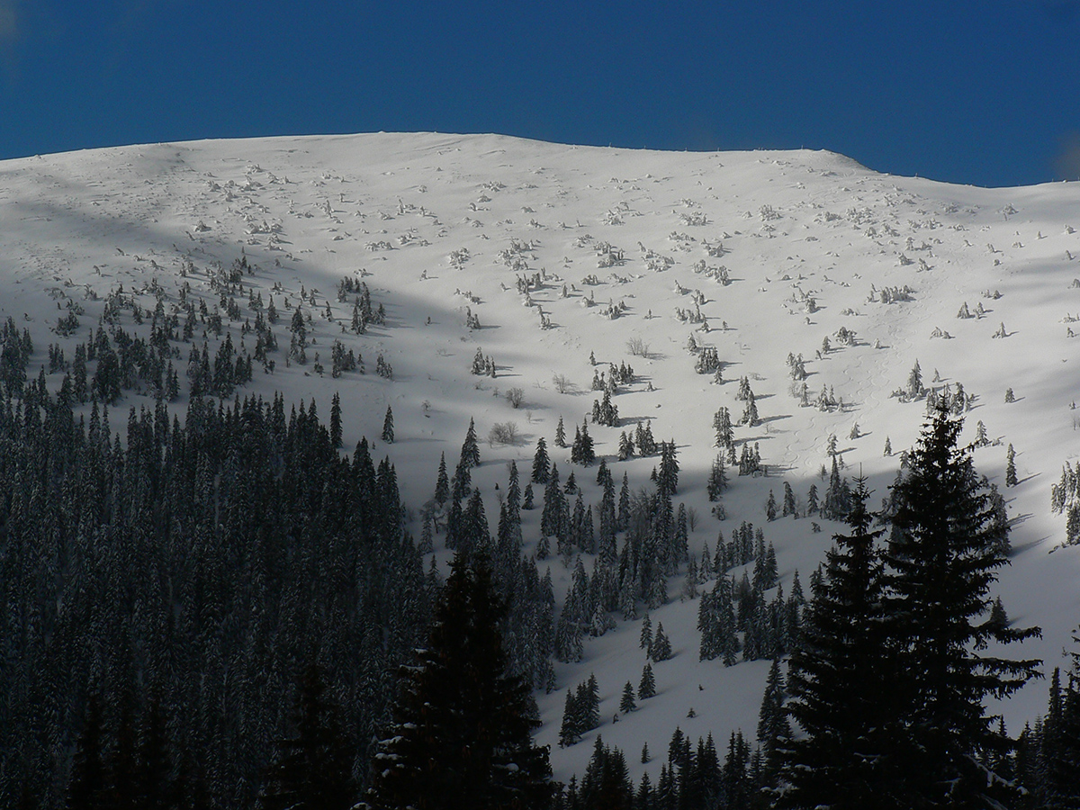 Potom nad lesom už paráda. Sneh akurát držal, ale nelepil, zo zadekovaných dolín aj dáke tie hmly vybehli na hrebeň, nebolo bárs horúco a viditeľnosť parádna. Tak som si „z výkladu“ ako prvé vybral juhovýchodné rebro Malej Chochule. Až dole po les úplná paráda. Kompaktný, rovný povrch, ani prašan, ani kašan, kôrka žiadna, len úplne dole už sneh trochu navlhnutý.