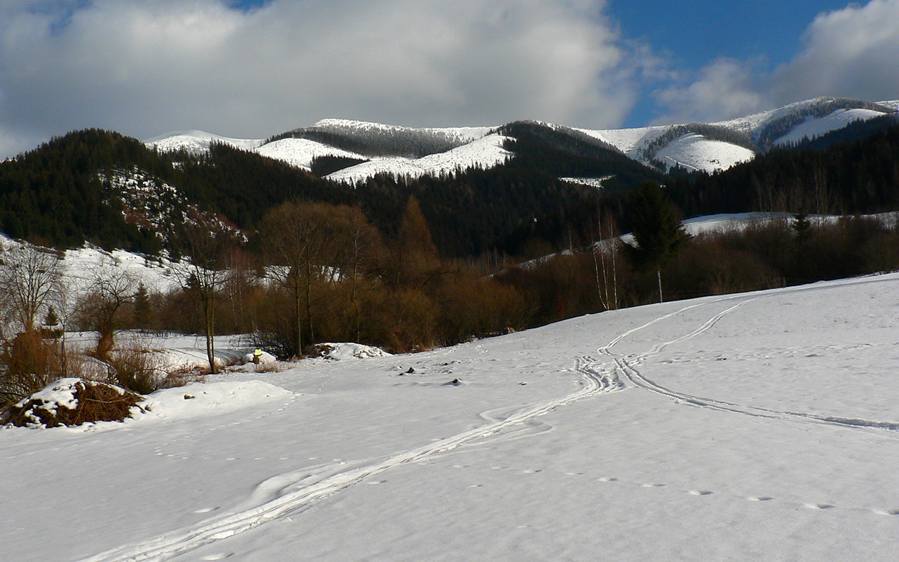 No a záver – už len do Lúžnej sa doplaziť voľajako... Tak ešte traverz popod Veľkú Chochuľu a Košarisko, krížom cez ďalšie oblúkmi pokreslené muldy a svahy, ktoré síce lákali, ale času už nebolo. V sedle pod Košariskom pásy dole. Chvíľa rýchla po vytvrdenom hrebeni, potom tri chvíle bežkovania, palicovania a korčuľovania v snahe dostať sa bez pásov do sedla pod Skalkou. Skoro sa mi to podarilo, ale nového snehu v nižších polohách pribúdalo a vlhol. Tak ešte posledné naliepanie na krátkych pár minút mierne do kopca, aby som sa na žltú dostal, a potom už popri kríži a po rúbaniskách „rýchlo a zbesilo“ dole. Inak celkom dobré lyžovanie by to bolo – lebo tvrdo, ale nie ľadovo, v lesíku pod krížom aj prašanové záveje. Ale čas odchodu autobusu sa blížil a či dolyžujem až do dediny, to som netušil.