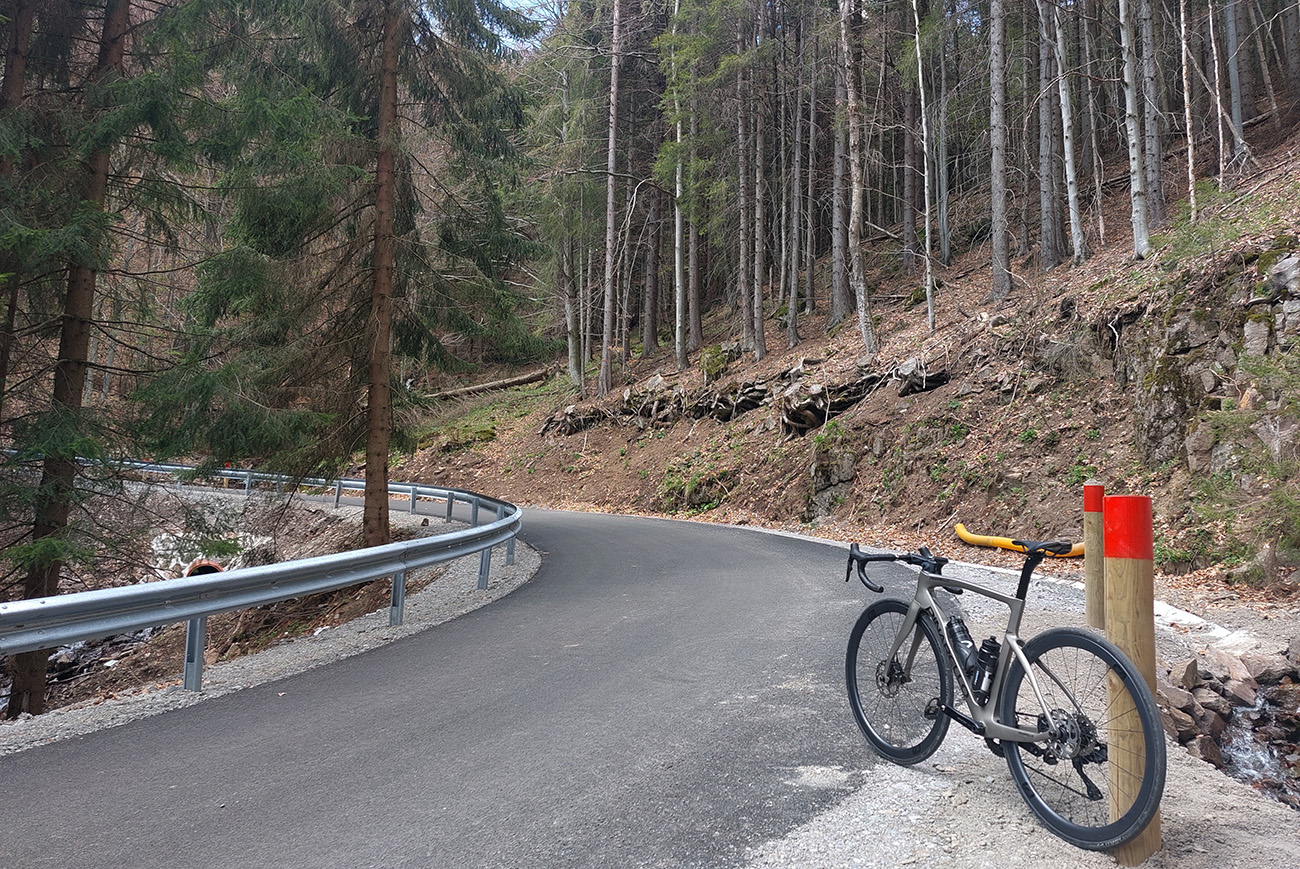 Druhý raz sa to dvihne na križovatke: Poľana doľava, doprava Snohy. Potom sa sklon už drží stabilne okolo 10%, často aj cez. Až po tú spomínanú križovatku, to sú nejaké dva kiláky – len kúsok pod ňou sa trochu zmierňuje. Tu je asfalt starší, ale stále dobrý, opravené sú len mostíky a priepusty: