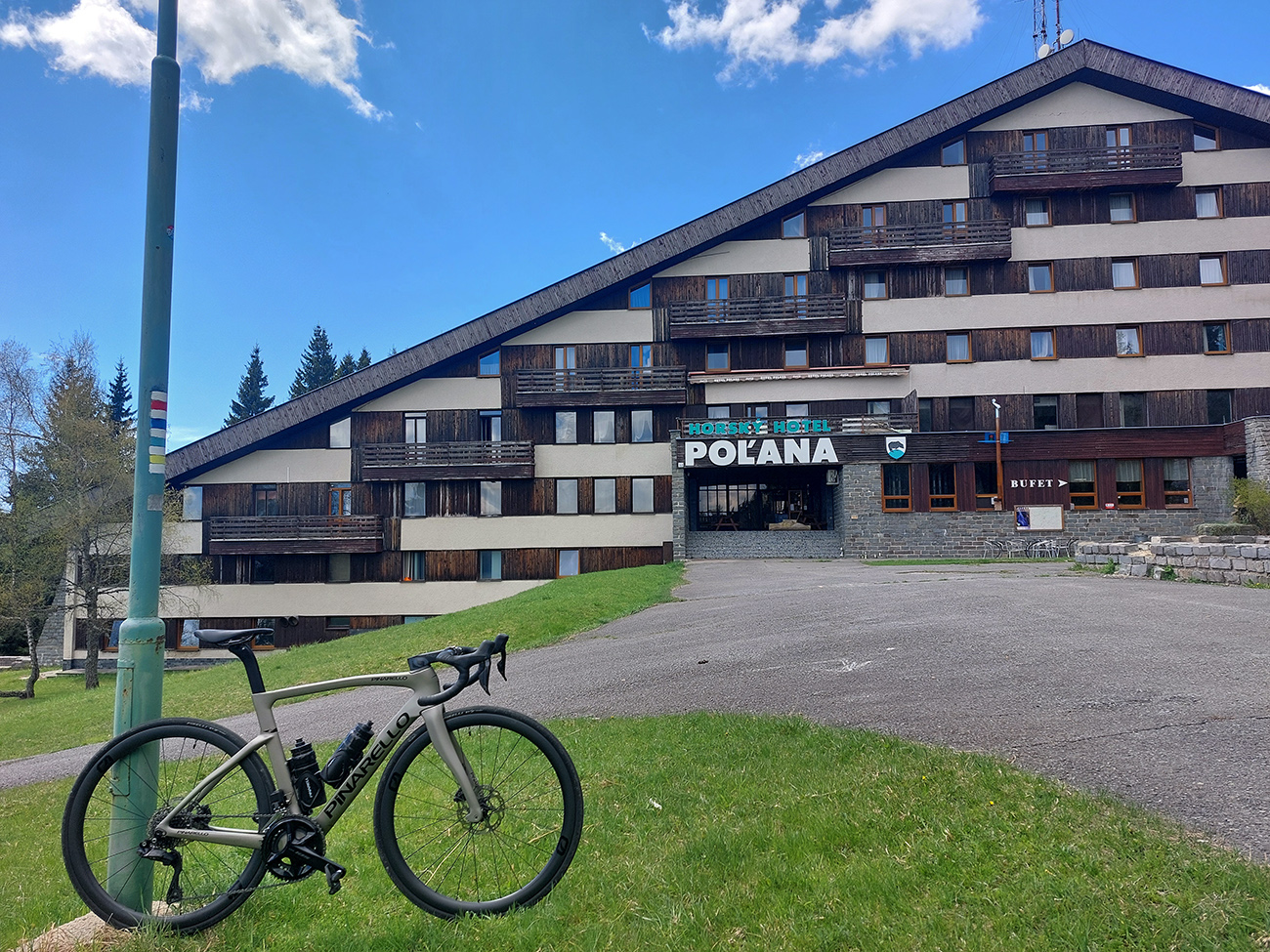 Do slušného sklonu sa treba oprieť zase na záver - asi 1,5 kilometra je to, od zákruty ponad potok. Pri smerovníku „Pod hotelom“ končí nový asfalt, treba to zvrtnúť doprava, obísť rampu a za stromami sa vynorí čelo hotela – sme v cieli.