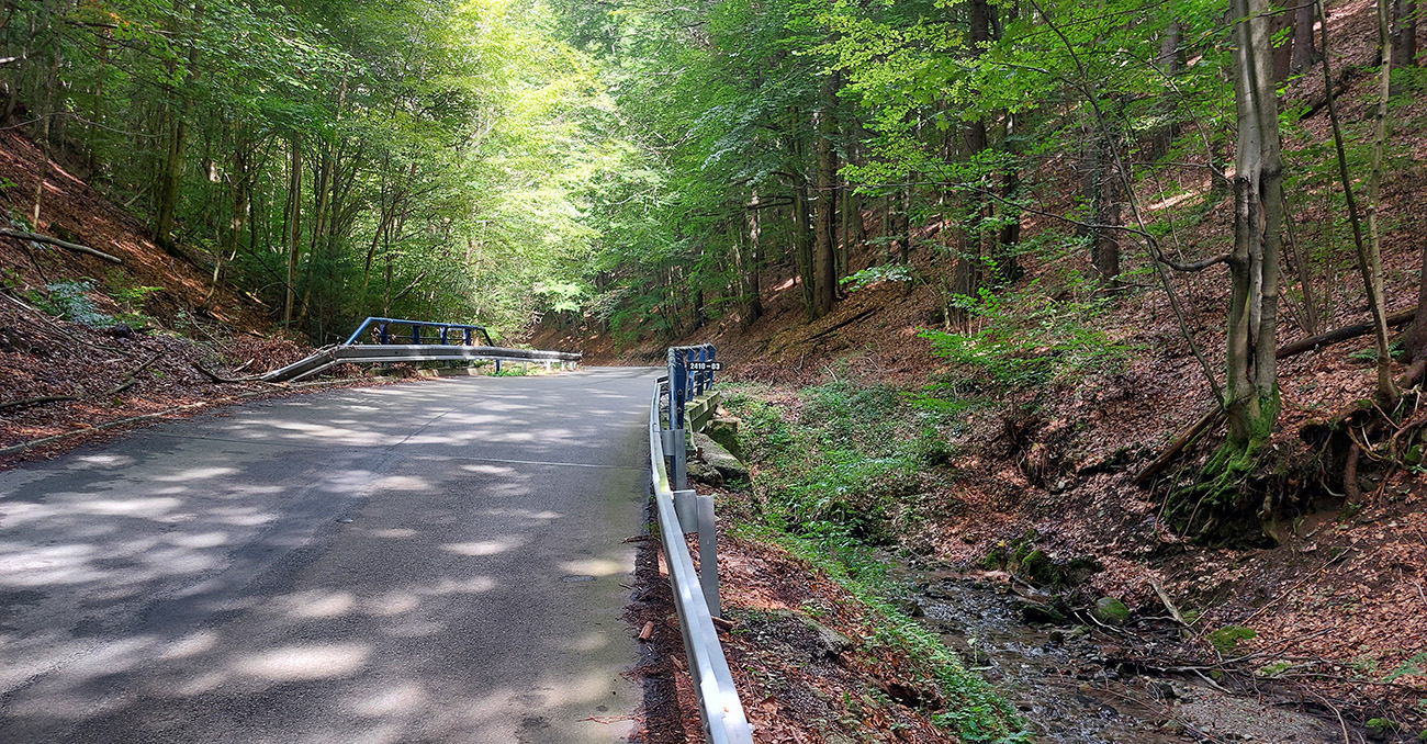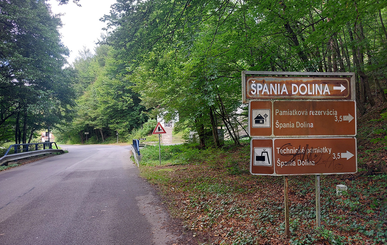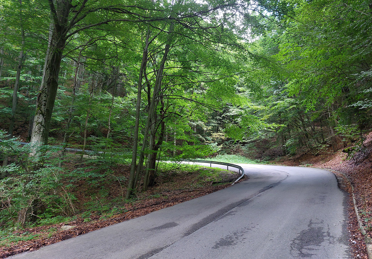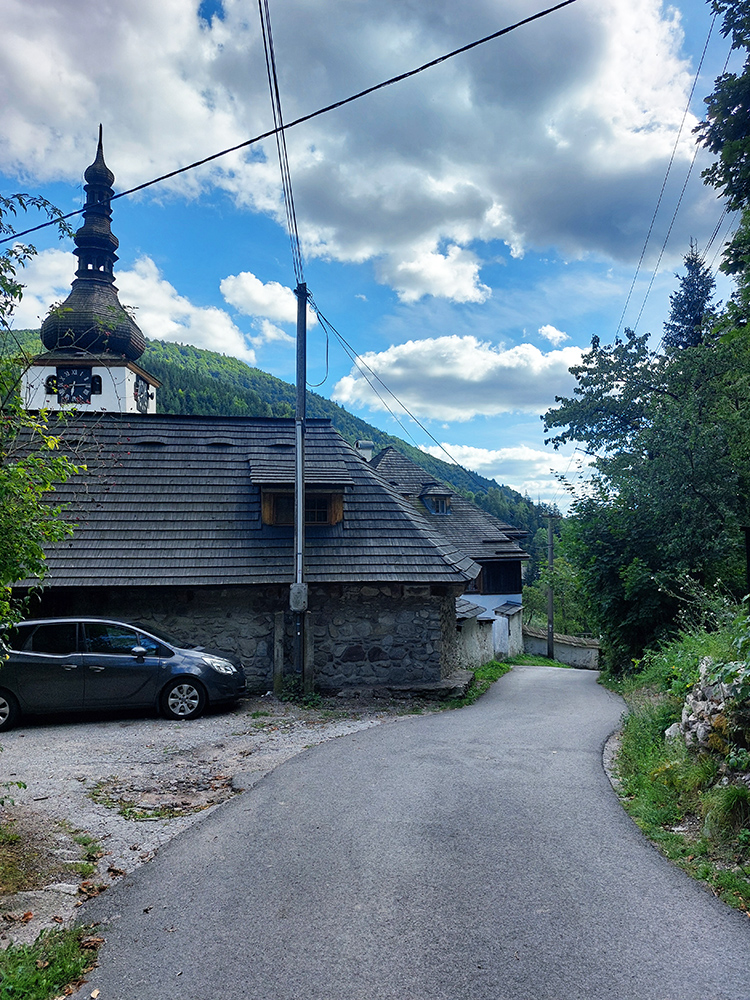 Na námestí teda doľava a začiatok výživnej finálovej päťstovky je priamo pri známych krytých schodoch do kostola. Cesta hneď naberie brutálny sklon a šírku len takého lepšieho chodníka (oba parametre až do konca), tak ak zhora pôjde auto, slabší kus môže mať aj problém. Ale nejaké vyhýbacie miesta sú. Koniec je na „Alžbetke“, pri smerovníku a pomníku.