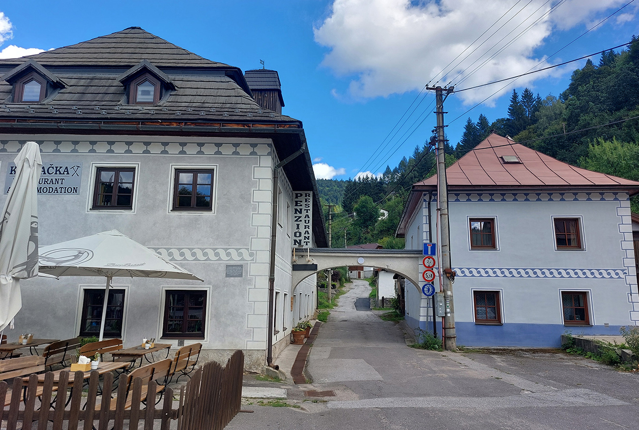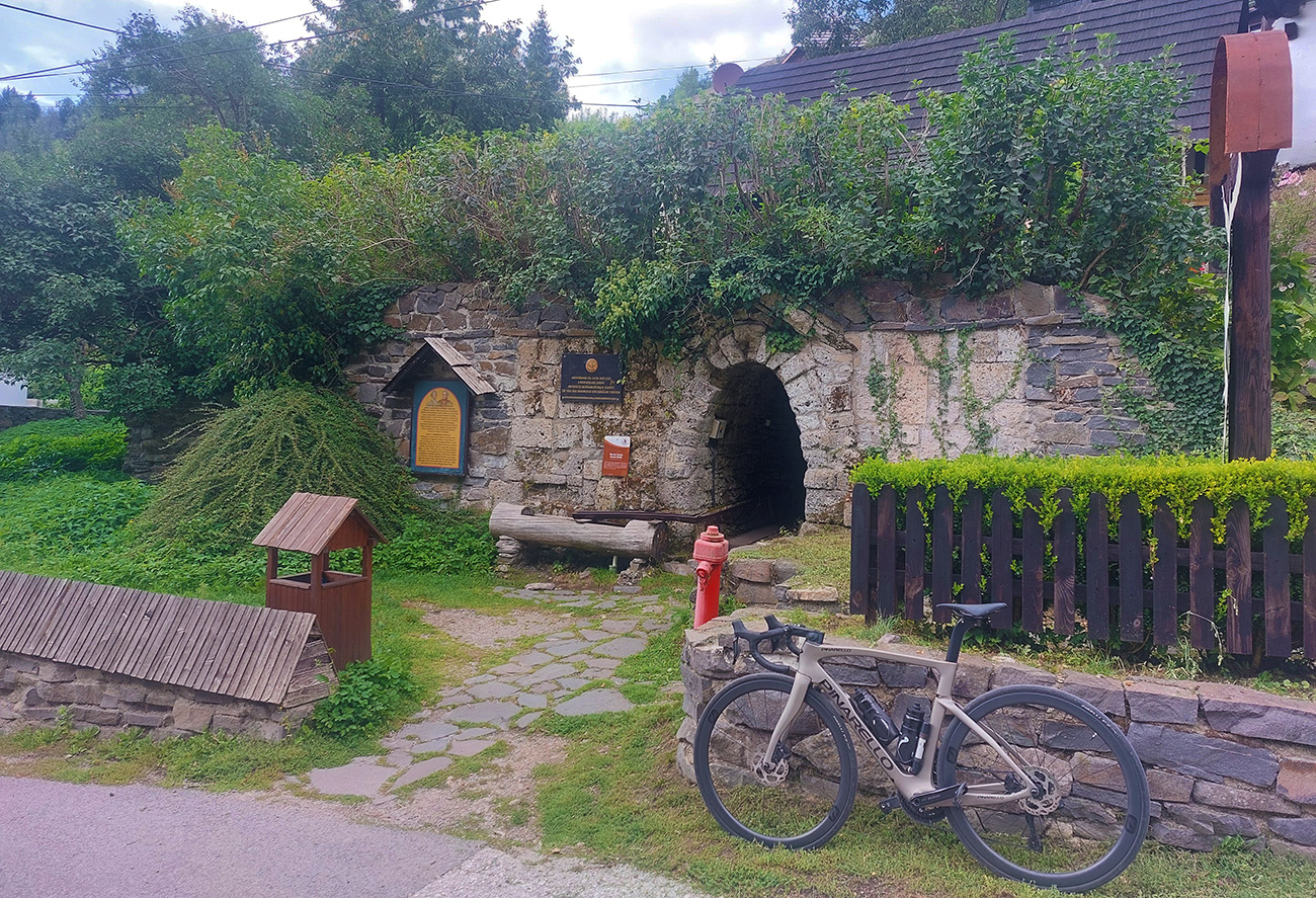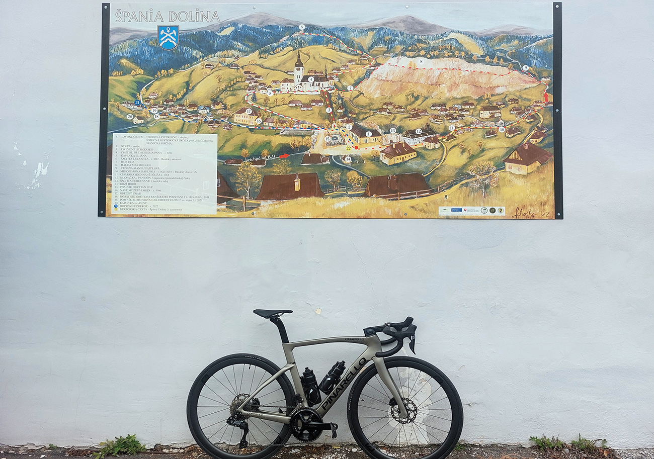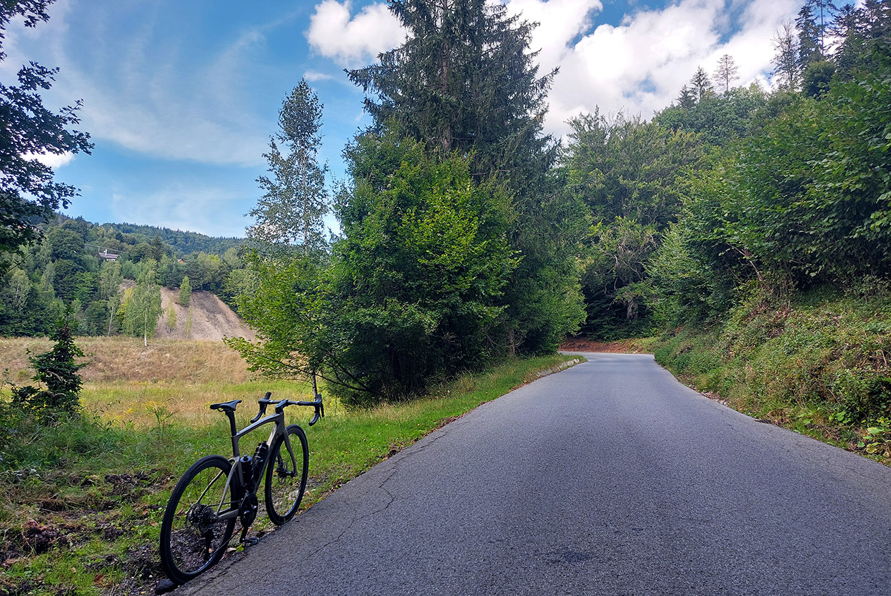 Tento živý banský skanzen blízko Banskej Bystrice je všeobecne známy, aj tu na Vetromagu sme sa oň už párkrát obtreli (odkazy dolu), ale vždy na tlstých gumách. No samozrejme, že tam vedie aj asfaltová cesta a už pár rokov je na nej dokonca aj žiletkársky komfortný povrch, tak nesmie tento cieľ chýbať ani v „žiletkárskej“ sekcii. Cesta je dosť široká, aj dva autobusy by sa obišli, jeden bezpečne obíde aj cyklistu. Výhodou/nevýhodou (podľa počasia a ročného obdobia) je poloha v tienistom lese, slnko na cestu zasvieti len popoludní, priamo od západu, juhozápadu. Aj to len ostrovčekovito, koľko koruny stromov dovolia. Stúpanie to nie je dlhé, po námestie necelé štyri kiláky, zato slušne výživné (8-10%). Kto si ho však chce naplno užiť, odbočí na námestí doľava a čaká ho ešte slušnejšia (priam vražedná, 20-percentná) gradácia pomedzi chalupy na záverečných 500 metroch. To je základný a najdlhší variant, s dobrým asfaltom až po jeho koniec. Z námestia sa ale dá pokračovať aj rovno – je to rovnako dlhé, len miernejšie a asfalt je tam podstatne horší. Celé aj so zjazdom nazad dole do Uľanky to potom vyzerá takto: