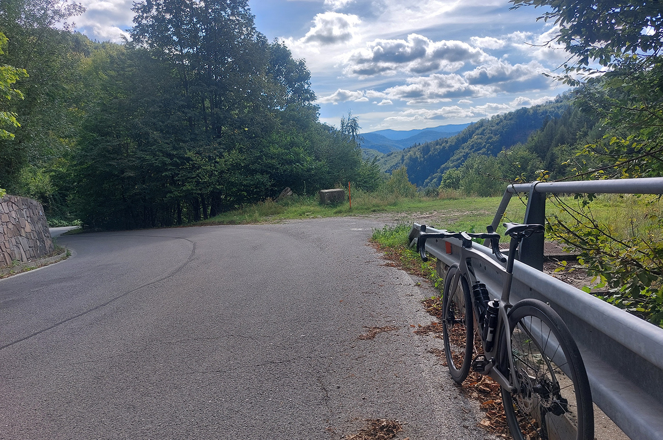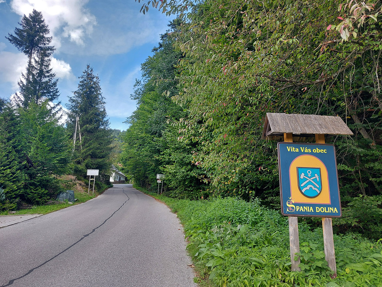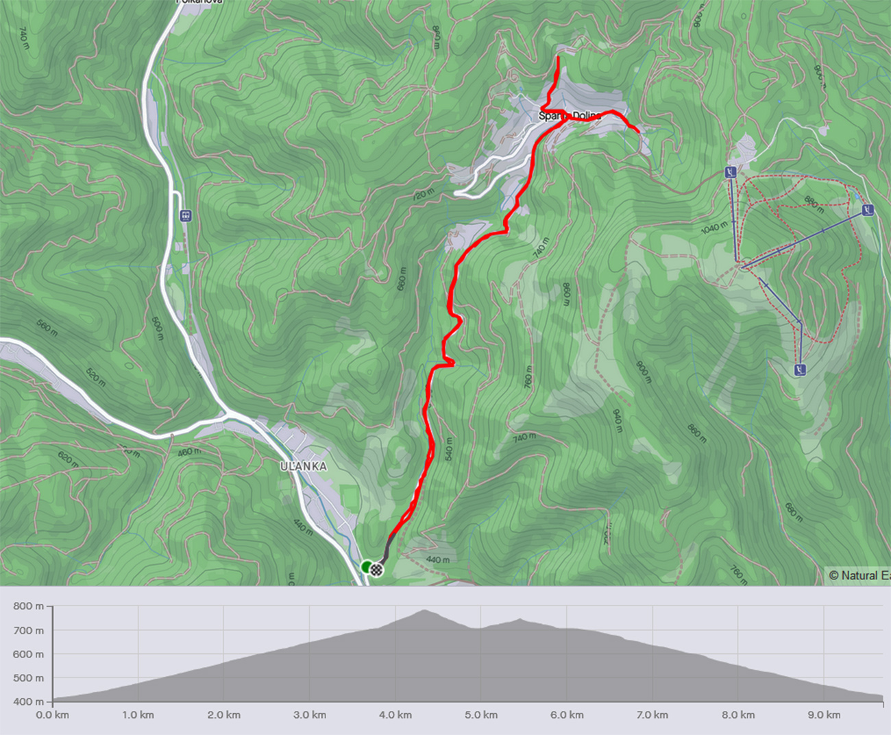 Tento živý banský skanzen blízko Banskej Bystrice je všeobecne známy, aj tu na Vetromagu sme sa oň už párkrát obtreli (odkazy dolu), ale vždy na tlstých gumách. No samozrejme, že tam vedie aj asfaltová cesta a už pár rokov je na nej dokonca aj žiletkársky komfortný povrch, tak nesmie tento cieľ chýbať ani v „žiletkárskej“ sekcii. Cesta je dosť široká, aj dva autobusy by sa obišli, jeden bezpečne obíde aj cyklistu. Výhodou/nevýhodou (podľa počasia a ročného obdobia) je poloha v tienistom lese, slnko na cestu zasvieti len popoludní, priamo od západu, juhozápadu. Aj to len ostrovčekovito, koľko koruny stromov dovolia. Stúpanie to nie je dlhé, po námestie necelé štyri kiláky, zato slušne výživné (8-10%). Kto si ho však chce naplno užiť, odbočí na námestí doľava a čaká ho ešte slušnejšia (priam vražedná, 20-percentná) gradácia pomedzi chalupy na záverečných 500 metroch. To je základný a najdlhší variant, s dobrým asfaltom až po jeho koniec. Z námestia sa ale dá pokračovať aj rovno – je to rovnako dlhé, len miernejšie a asfalt je tam podstatne horší. Celé aj so zjazdom nazad dole do Uľanky to potom vyzerá takto:
