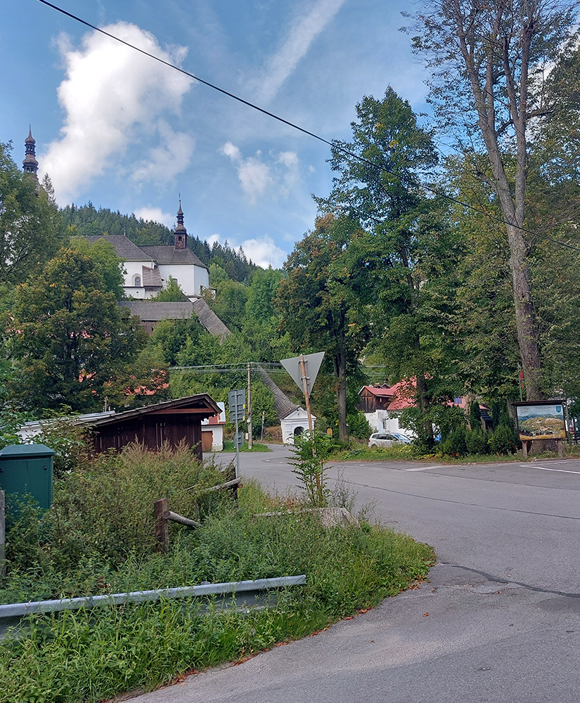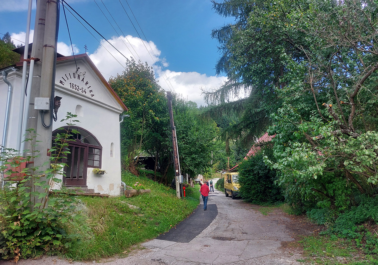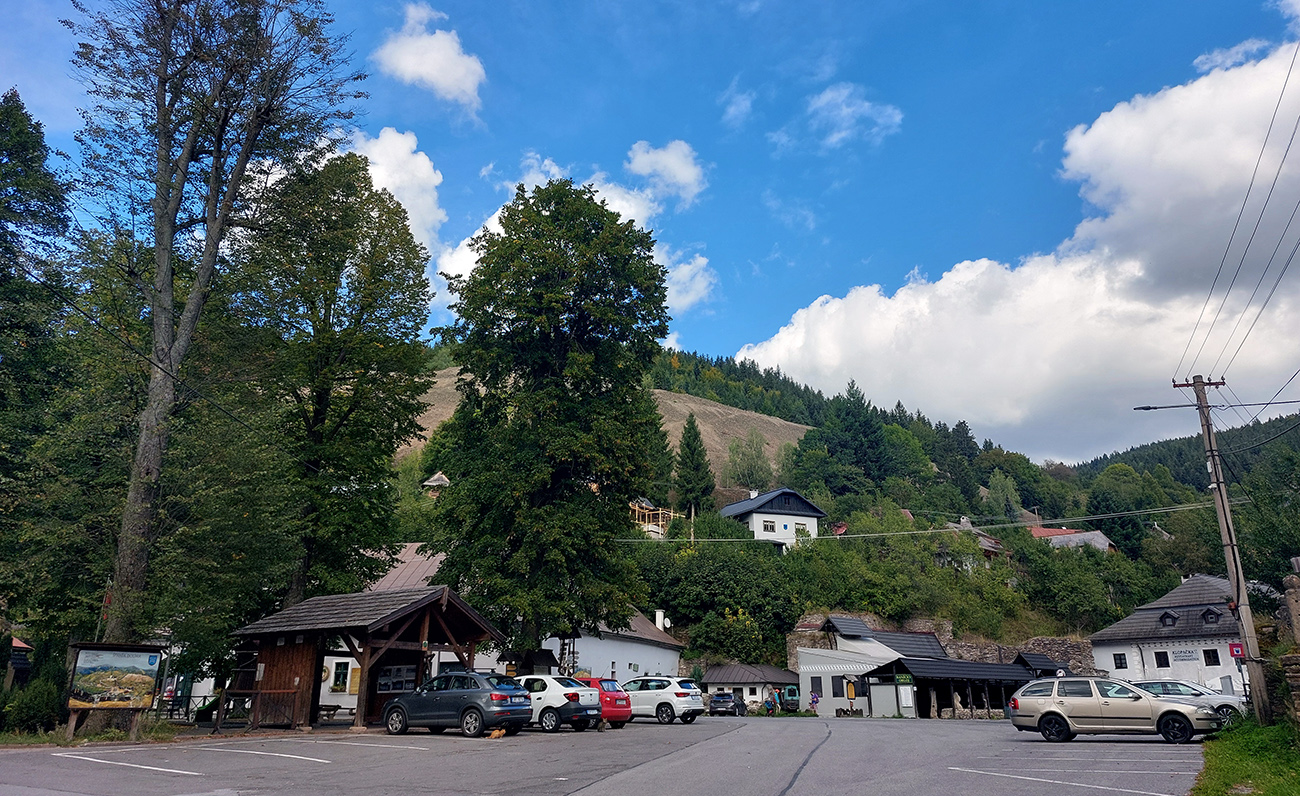 Miernejší variant vedie z námestia rovno popri Klopačke, Dennej štôlni a Misionárskej kaplnke, tiež pomedzi chalupy, ale nie až také vypipľané, po rozbitej ceste až k poslednému domu. Nazad na námestie potom s pohľadom na známu haldu Maximilián, ale lepšie je dívať sa pod kolesá.