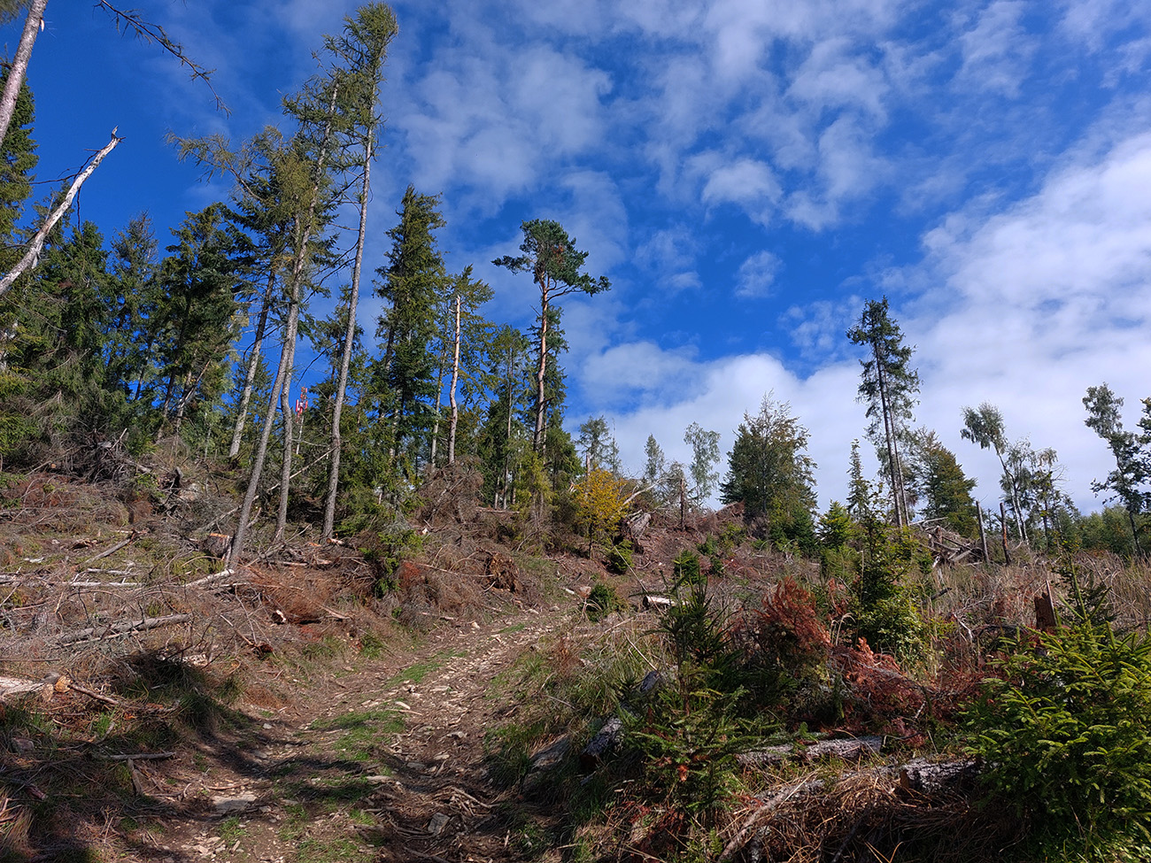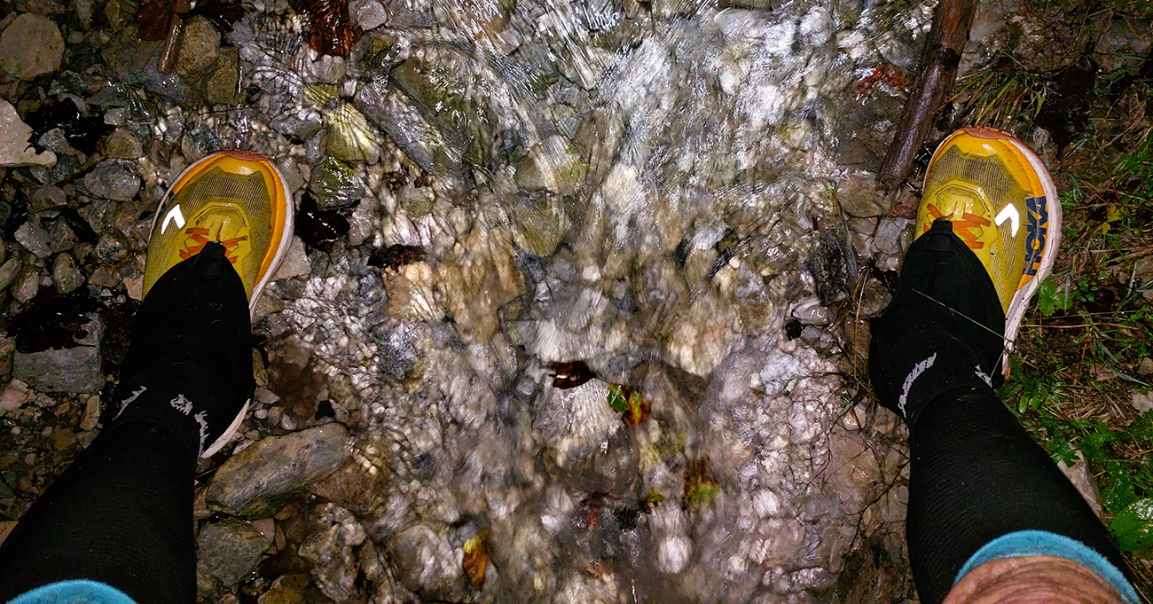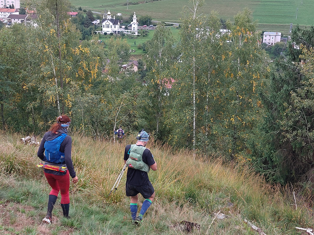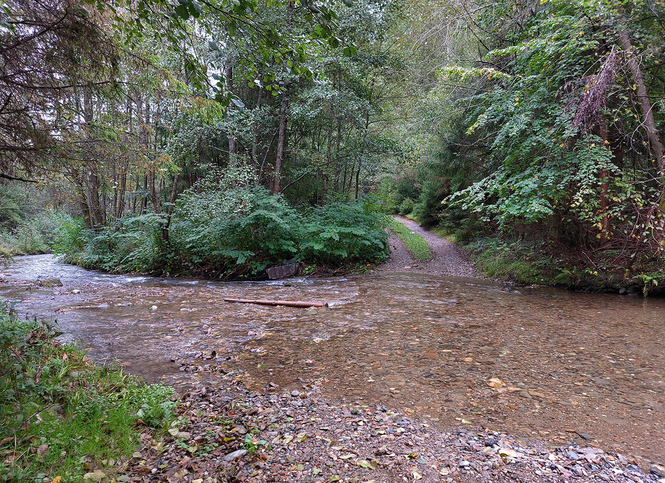 Zatiaľ sme sa asi všetci optimisticky snažili vyhýbať potoku, ktorý si tiekol po ceste v tej doline. Šmakocinky ale prišli vzápätí, keď sa bolo treba dostať z doliny von – lebo sa medzitým zmenila na roklinu. A všade vo svahoch vetrom pováľané stromy. Pritom to bola len rozcvička. Olaf za kompjútrom isto už s úškrnom sledoval, ako pohyb gps-bodiek spomaľuje a schaosieva. Škodoradosť – najlepšia radosť, ale nikto nikomu predsa nekázal ísť po spádnici, že?