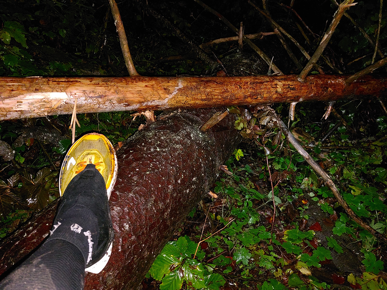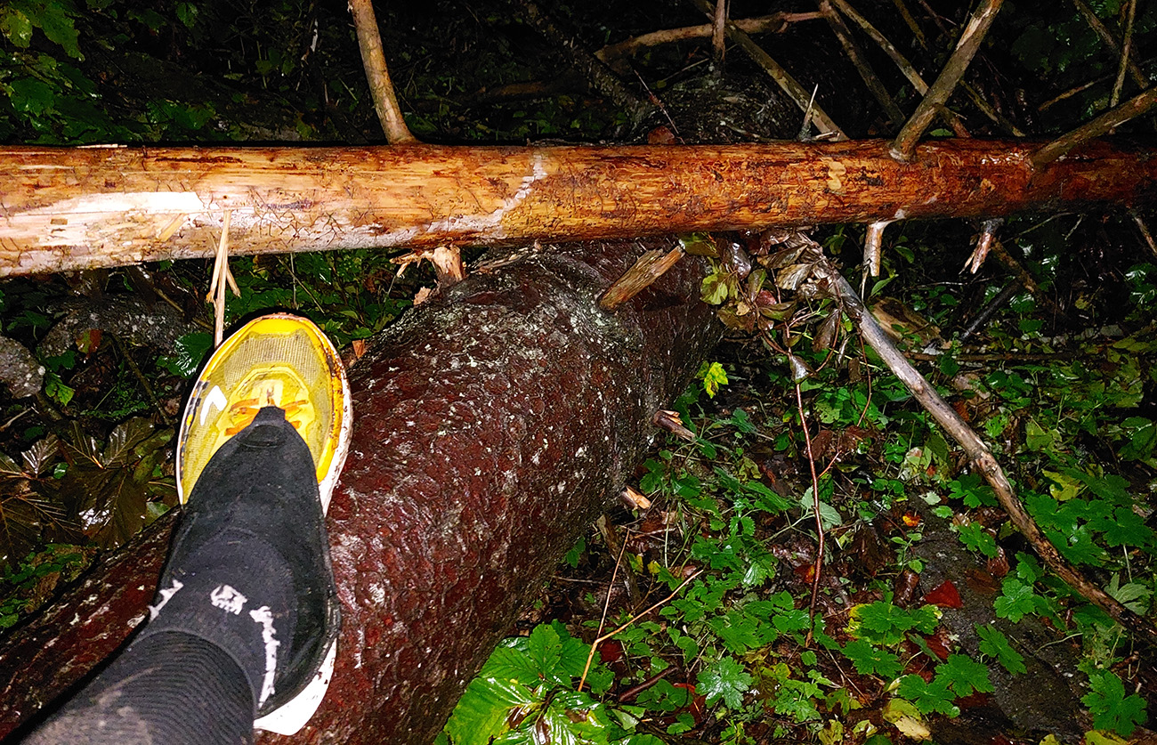Najlepšie na tom bolo, že ako sa sklon zmierňoval, popadaných stromov pribúdalo. Takže na hrebienku medzi Veľkým sedlom a Zlatým stolom to bol asi „najkrajší“ úsek celej trasy (podľa Paťa isto). Spartan je šuviks oproti tomuto. Našťastie svitalo.