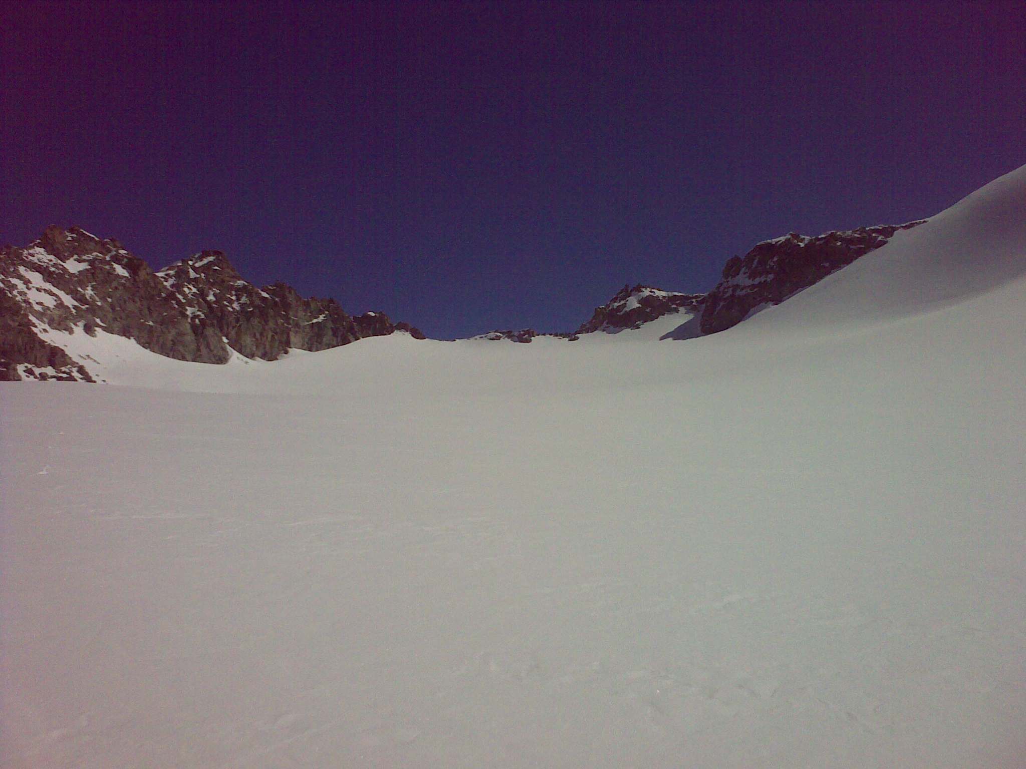 Od chaty vedie strmý svah, ktorý bol celý zamrznutý, takže „haršajzne“ treba mat stále zo sebou. Kúsok pred nástupom na ľadovec je tam jedno kľúčové miesto, ktoré je v lete riešené rebríkmi, teraz tam bola zosypaná lavína. Cez lavínište sa dalo v pohode vyšplhať s lyžami v rukách. Ďalej je to bez väčších problémov až k ľadovcu. Na ľadovci je už len mierne stúpanie a je to taký skialpový relax. Ľadovec je obklopený zo všetkých strán vrcholmi. Vpravo Piz Morteratsch 3751 m.n.m. a vľavo Piz Tschierva 3546 m.n.m. a priamo pred vami sedlo, cez ktoré sa dá dostať k Boval Hütte.