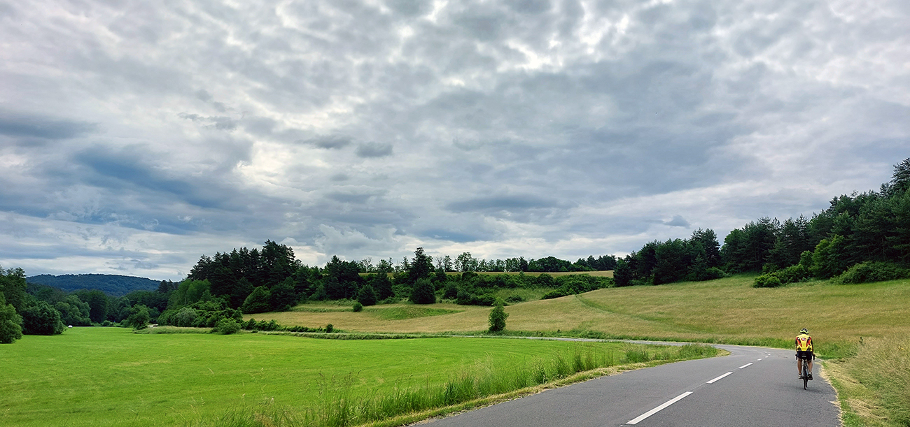 Vo Veľkej Lúke začína práve tá pekná krajinka – cesta sa jemne vlní pomedzi pahorky okolo potoka Lukavica. V rovnomennej dedine žila spisovateľka Hana Ponická. Túto cestu mám pod kolesami rád, a ešte viac odvtedy, čo konečne opravili jej povrch.