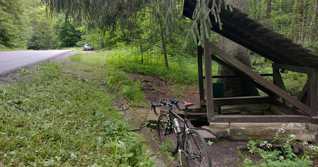 Energiu treba, lebo Hrochoť je zvláštna dedina – z každej strany je to do nej do kopca. Na takej náhornej plošine ju postavili, nie dole pri potoku ako väčšinu dedín. Z mojej strany, od Hučavy, sú to zo tri poctivo strmé serpentínky, také dva kiláčiky. Potom naopak dlhý a len mierne pozakrúcaný zjazd lesom do Čačína, po novom asfalte, takže paráda. Pred jeho koncom som zabrzdil a dotankoval - fajnú, studenú, železitú, na trávenie dobrú, aj keď menej známu oproti tej čerínskej, ktorú viacerí chodia naberať do prístrešku v Čačíne, pri plničke.