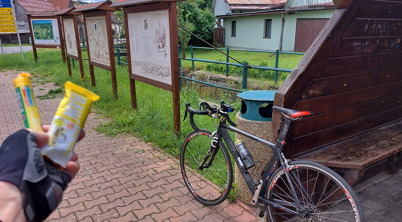 Jajže bože hlad veliký, keď som došiel na Poniky – lebo tá minerálka ozaj akosi dobre podporuje trávenie. Tak prestávočka kratučká, priamo v city, pri tabuliach pripomínajúcich slávneho rodáka Štefana Žáryho (inak manžela Hany Ponickej) a najznámejšiu báseň o Ponikách (Turčín Poničan od Sama Chalupku). Vylúskal som skoro celý šúľok hroznového cukru a zajedol raw tyčinkou. Fajný obed, aj mi bolo treba, lebo najparádnejšie tri kopce som si nechal na záver. A hneď prvý ten z Poník do Šalkovej, veď inokade odtiaľto ani sa ujsť nedá, ak som sa nechcel vrátiť. Aj tu je už pár rokov nový povrch (skoro až do Šalkovej), k tomu ako bonus výhľady, pekná cesta je to. Len záver zjazdu hrboľatý, ale zase s nejakými výhľadmi, tentokrát na romantikuš Biotiku a Nízke Tatry v pozadí.