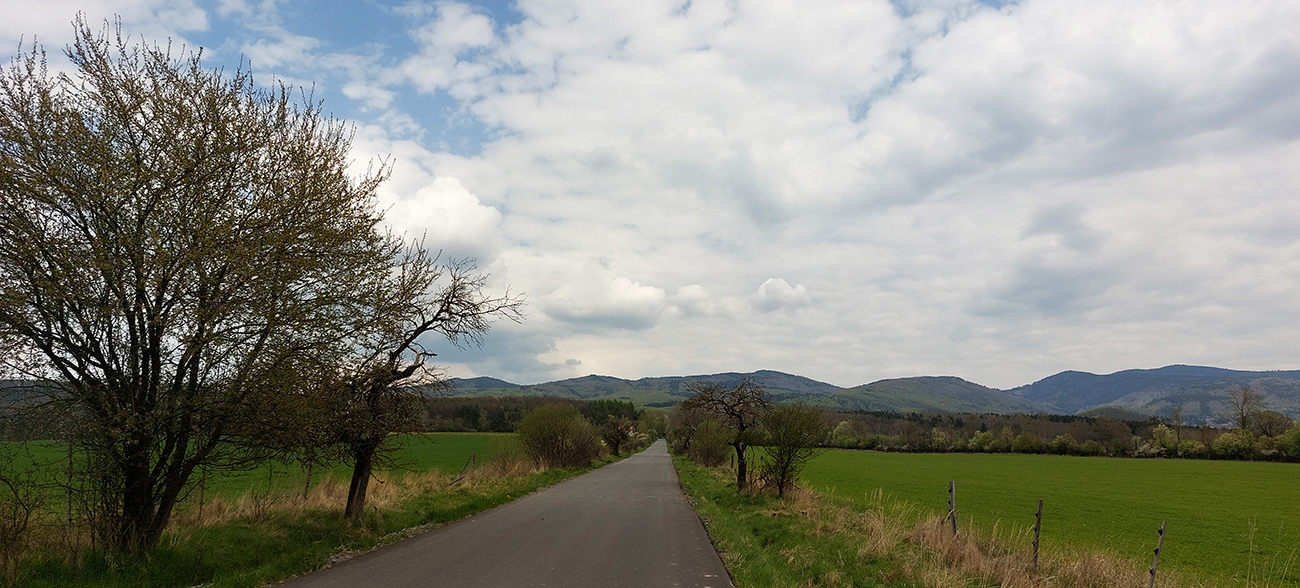 V Očovej máj už postavený, tak som len pozdravil Mateja Bela a fičal ďalej, do Hradnej, cez ďalší malý kopček. Výhľady ešte šírošírejšie: zľava prášili na poliach traktory, sprava smrdela repka, spredu jemný severovýchoďáčik povieval. Podarilo sa mi aj dobrý skutok spraviť a pomôcť dofúkať opravený defekt. Lenže tie autoventily sú na bajkoch poriadna blbosť – takže už som nesmel dostať defekt ja, lebo som kvôli dofukovaniu otočil tesnenie v pumpe a nazad už samozrejme otočiť nešlo. Tak v Hradnej ďalšia doľava, zase do pravého uhla. Predo mnou vyvstala „výsosť Poľany hory“ so zníženinou Príslopov takmer priamo "v strede záberu". Začal som sa tam teda pomaly štverať, len mi nejako rýchlo začali dochádzať ľahké prevody, hehe...