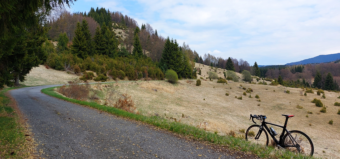 Spomedzi voňavých trnkových mantinelov som teda prešiel do slnkom ešte presvetleného, sviežo zeleného, rozštebotaného bukového lesa. Popri ceste si tam pomedzi veľké balvany žblnká potok, no romantika ako bič! Asfalt s výškou akoby stále lepší, zato posypu na ceste po zime ostalo hojne. No ani ten moc nevadil, autami bol pekne vyhádzaný do stredu a na boky. Len už som dlhšie išiel na „gašparkovi“ a ďalej nebolo kam dávať. A stále častejšie zo sedla, aj keď sklony tu nie sú ktovieaké.