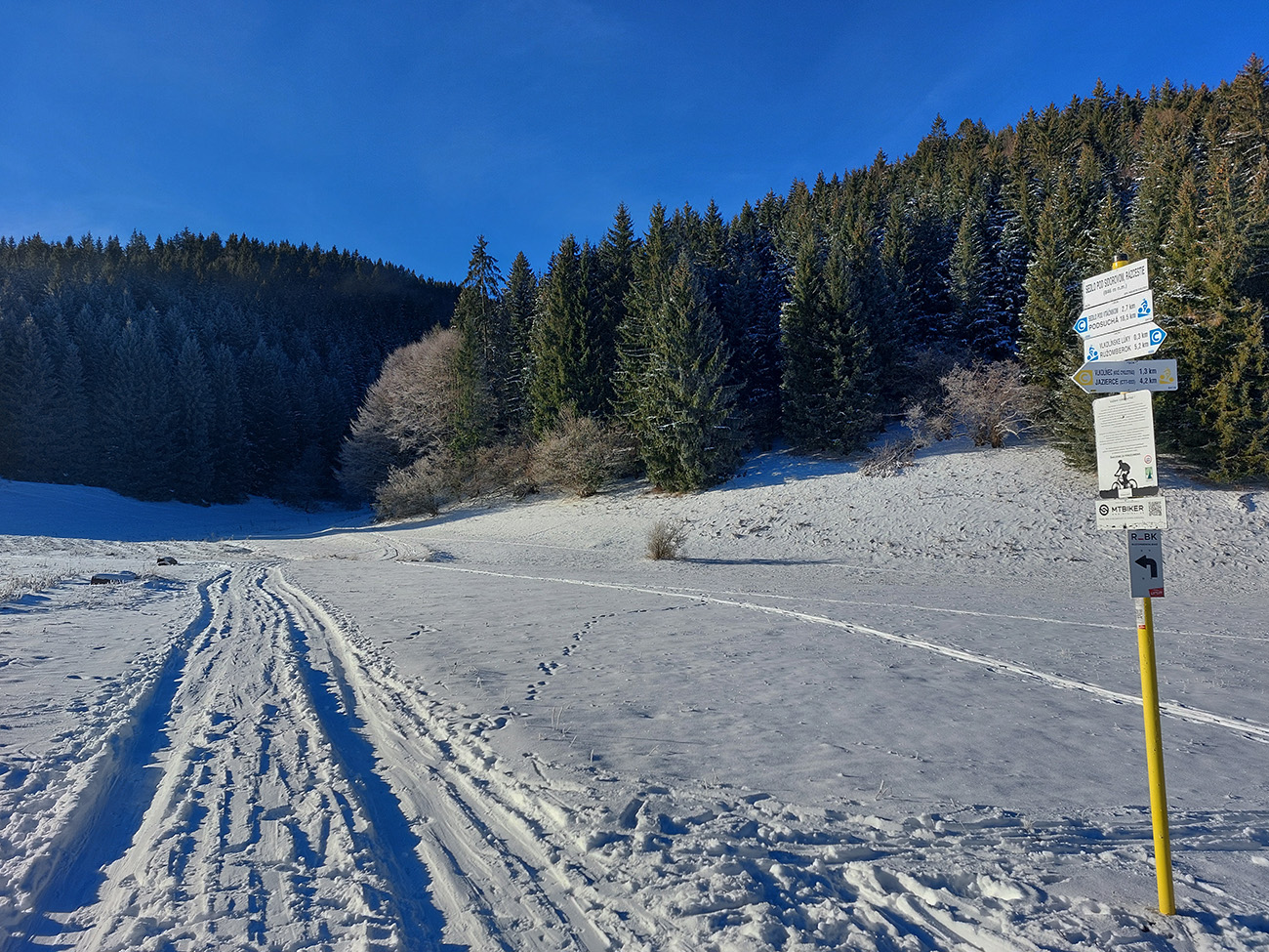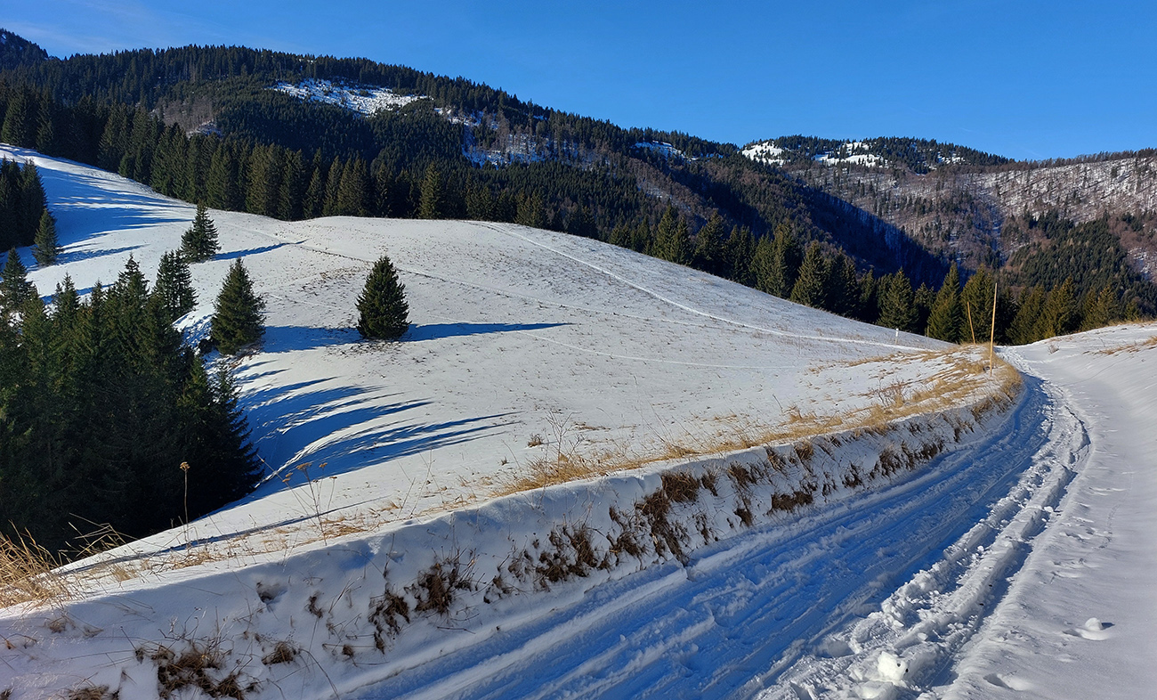 Na lúkach pod Vtáčnikom tiež samozrejme bieda a zjazdík dole ku smerovníku po snehu len vďaka vetru a tomu, že cesta je v ryhe, tak ju snehom trošku zafúkalo.