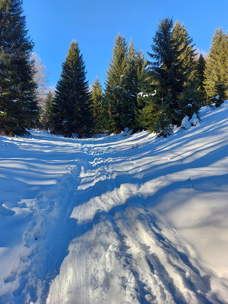Takže po zjazdovke len kúsok a hneď nástup na Medvedí chodník. Ten centimeter snehu na ňom je uchodený, vytvrdený, až vyleštený a zrána zamrznuto hrkotavý. Húfy piraní tam plávajú, ale všetky vidno zďaleka, tak na výstup komfort. Alebo aj preto, lebo som pre istotu nasadil kameňačky.