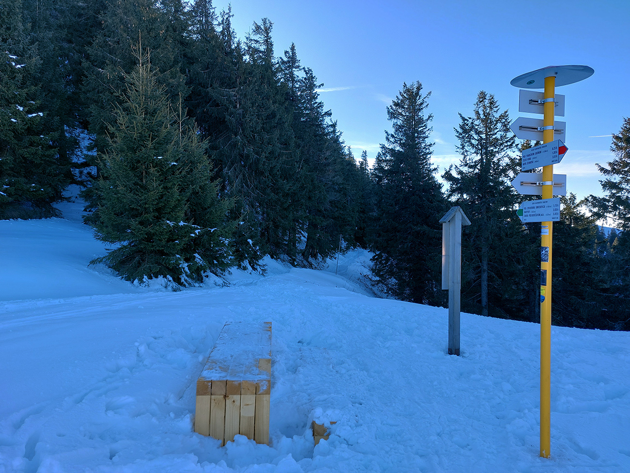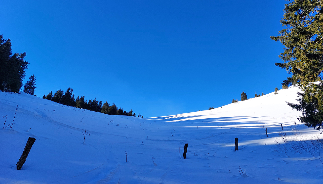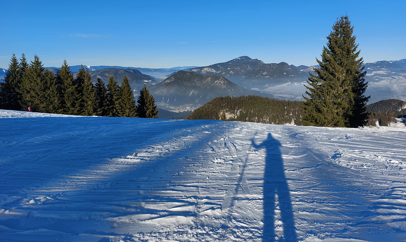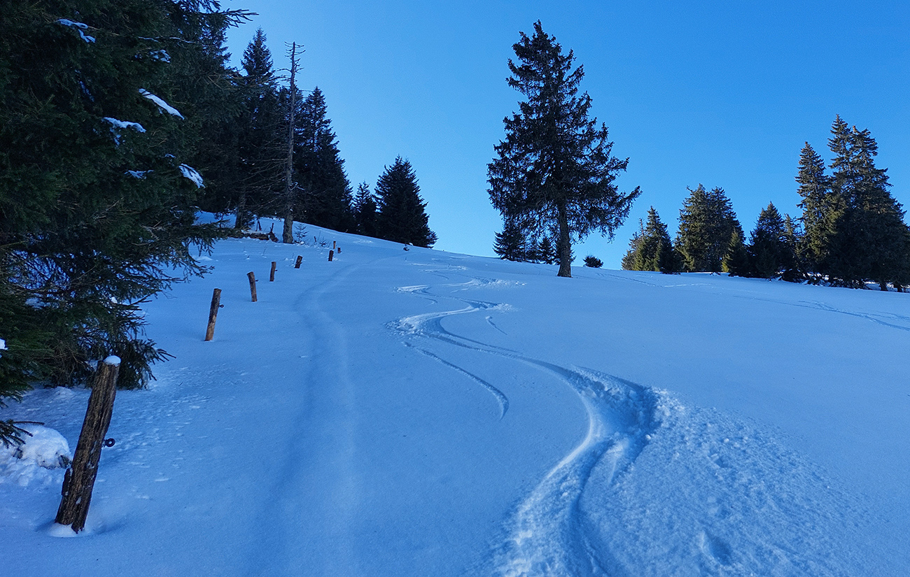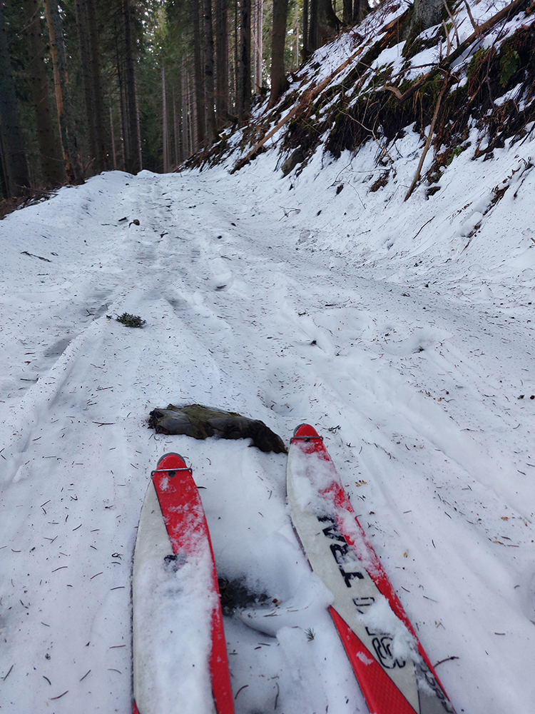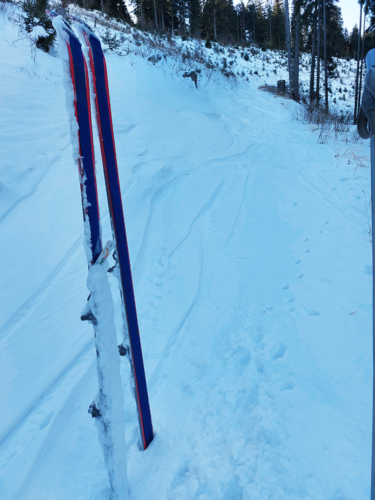 Slnko nízke, ukryté za stromami, prášku (kolo obeda už troooošku vlhnúceho) tak 10 cm, pod tým niečo staršie a hutnejšie, no fakt lepšia voľba ako striedať lepidlo a vatu na hrebeni smerom na Smrekovicu. Krátke síce, ale parádne lyžby, každá dĺžkou tak akurát na jeden záťah.