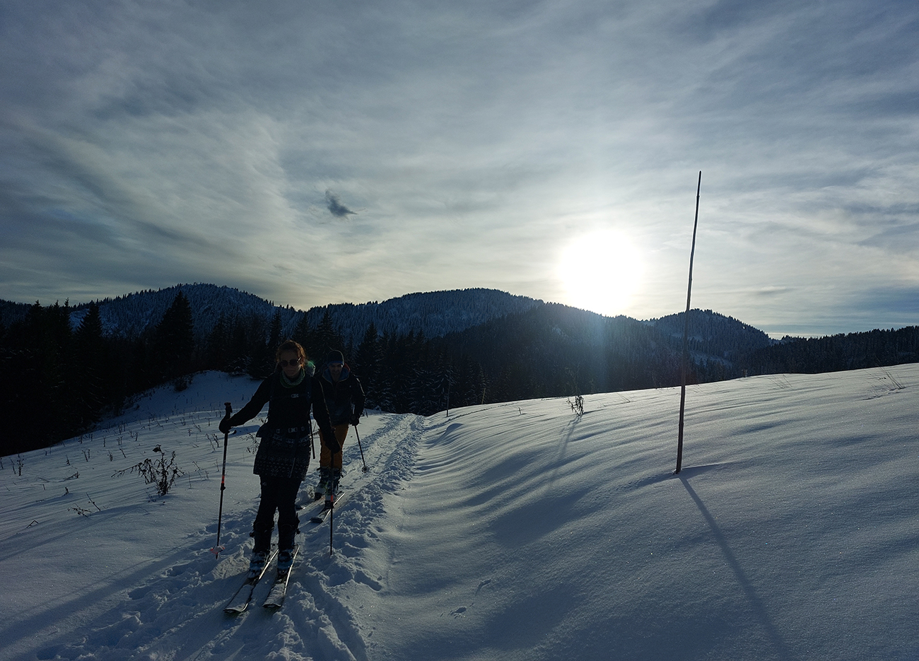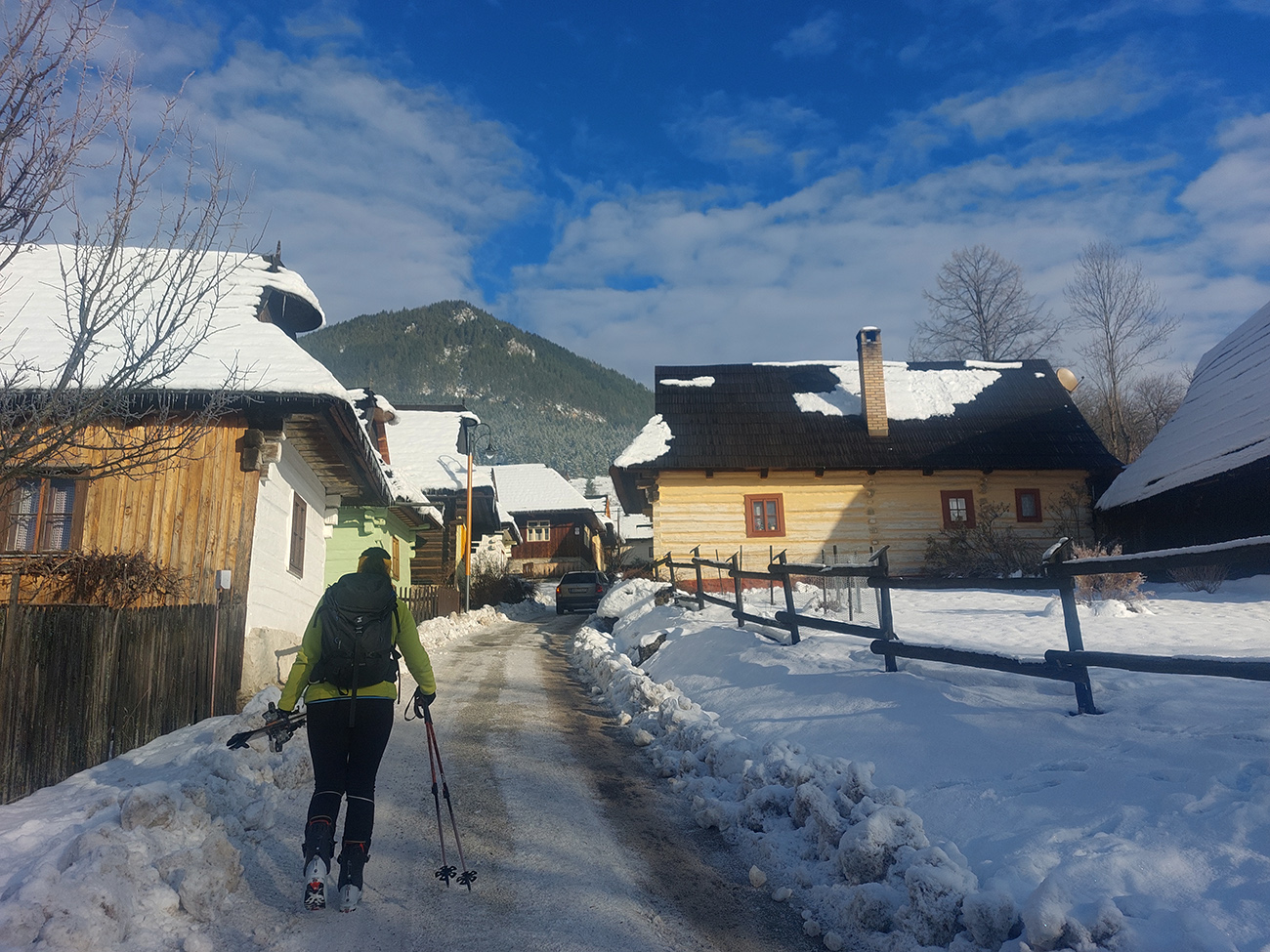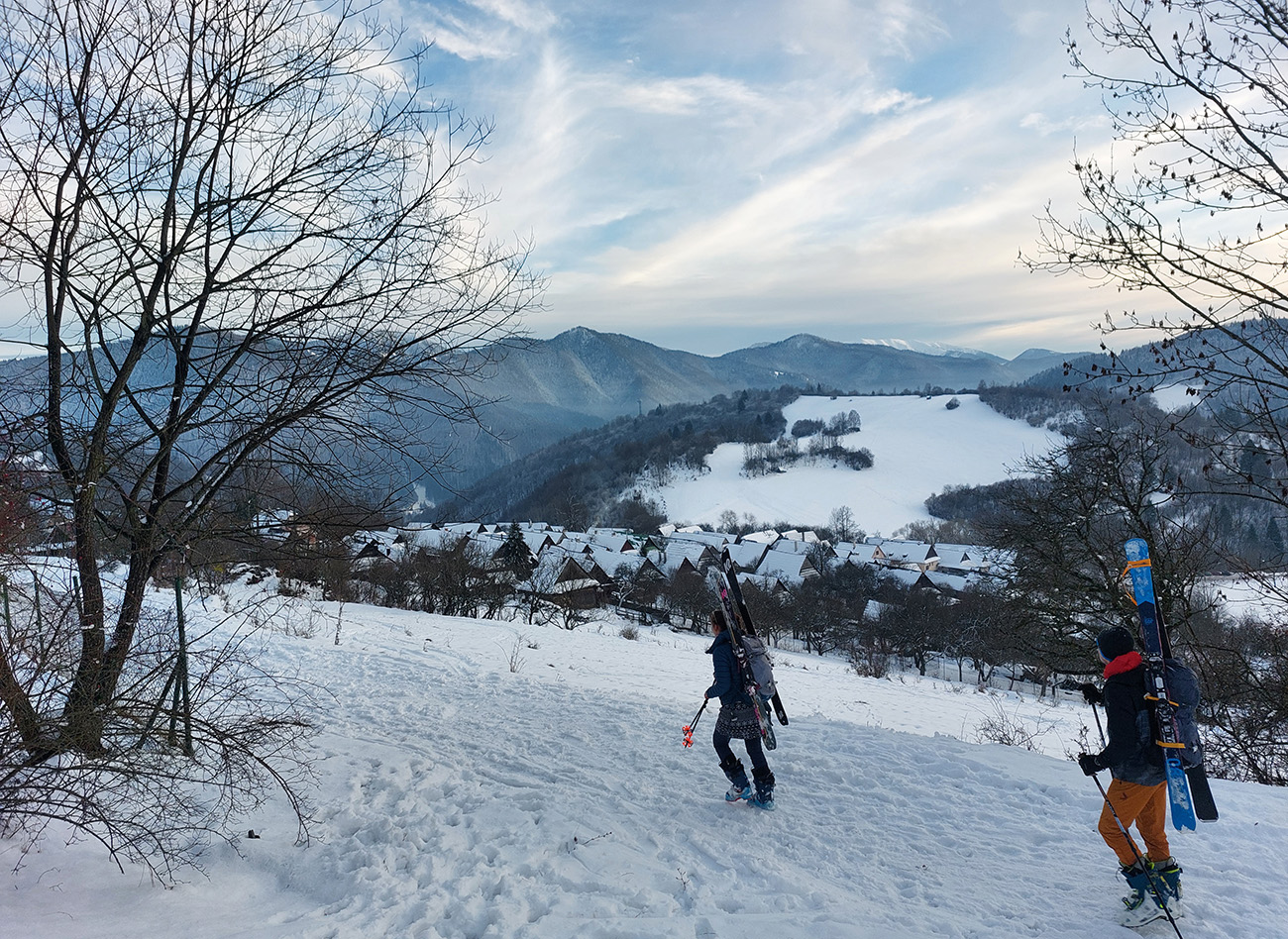 Haliny a Sidorovo na nás dohliadali pri nahadzovaní lyží na batoh, lebo po južnej stráni dole do Vlkolínca sa ani kameňačky riskovať neoplatilo. Ale zato veľkolepé výhľady na Nízke Tatry v diaľke a obielené strechy dreveníc pod nami – no čo viac si priať na rozchodenie do sezóny? Super to bolo a ďakujem modelkám za pózovanie!