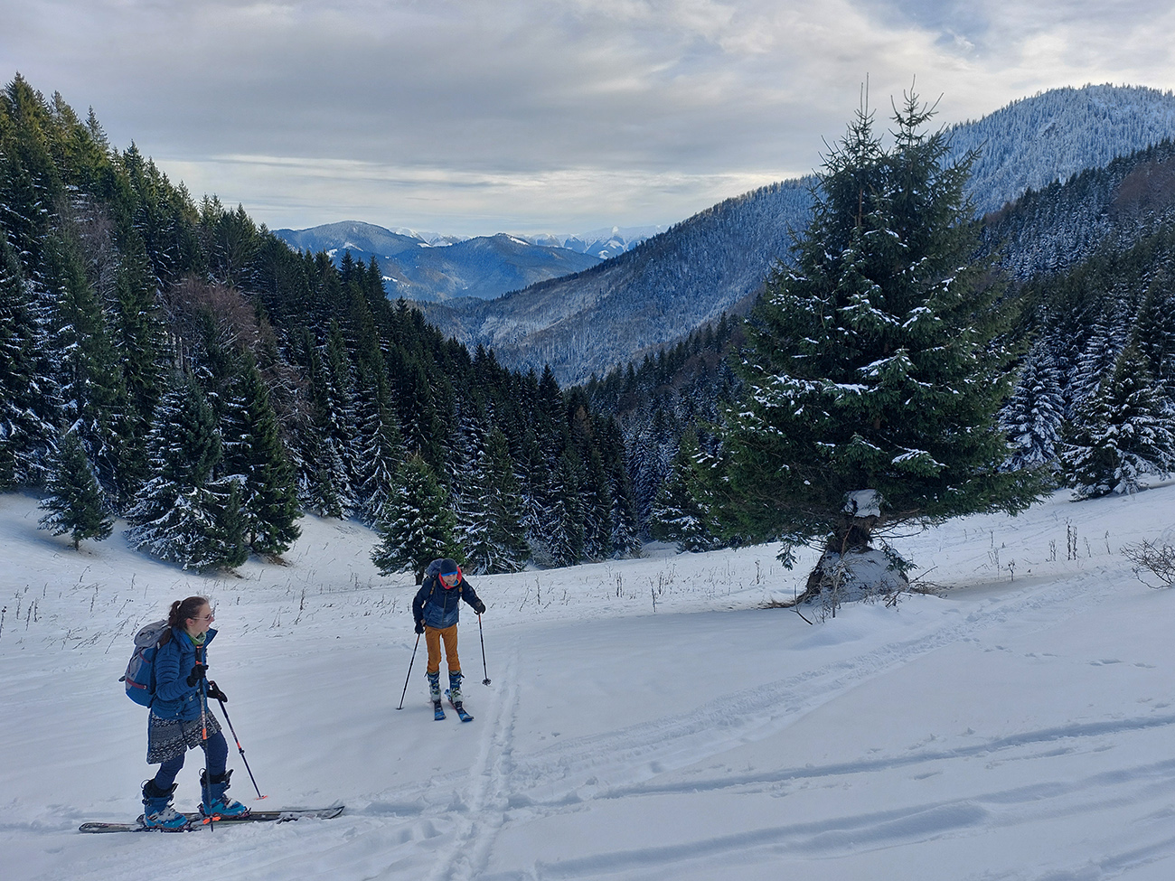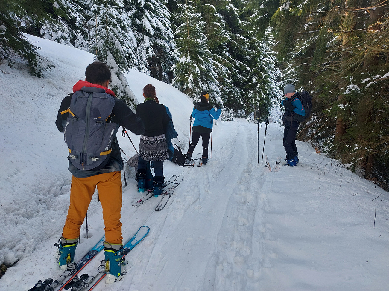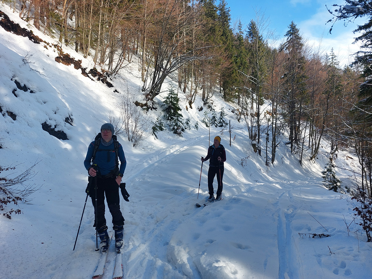 Taaak davaaj po zvážnici do záveru Čutkovskej doliny, že zdola obzrieme možnosti pod Nižným Šiprúnskym sedlom. Zvážnica komfortná, stopa hlboká, vyleštená, prechod cez pramenisko bezproblémový, snehom pekne prikrytý. Len popod padnutý strom sa bolo treba lepšie zohnúť. Alebo obísť.