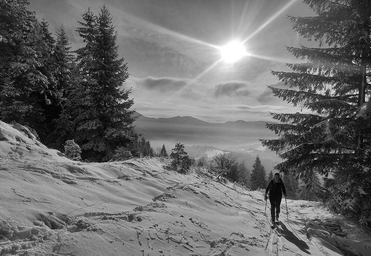Podarilo sa zahájiť o týždeň skôr ako vlani, aj to je už úspech! A dalo by sa vlastne ešte o týždeň skôr, po prvom poriadnom snežení. Niekde, lebo veľké lokálne rozdiely ten navlnený snehovo-dažďový front priniesol po 20. novembri. Zámer bol ísť na Smrekovicu, lebo v dolinách snehu málo a ešte aj to zlízal lejak, nad lesom zúrila pri prechode frontu víchrica a vydrela všetko do ľadu. Zato Smrekovica a okolie presne v tej ideálnej medzivrstve, dokonca na severných svahoch sme nesmelo dúfali aj v nejaké lyžovateľné prášky na zmrznutom podklade. V Ružomberku snehu nula, ale v hlave ešte zneli správy, ako práve pred týždňom v Bielom Potoku asi ako prví na Slovensku spustili vlek – takže oproti cez dolinu, okolo Vlkolínca, musí byť snehu tiež toľko, že by sa aspoň hore brehom dalo... A aj tak bolo – v smere z mesta na juh snehu okolo cesty rapídne pribúdalo! Čiže zmena plánu, odbočka doprava skôr a reťaze ostali v kufri, lebo na parkovisko pod Vlkolíncom cesta odhrnutá, posypaná, aj keď s ostrovmi ľadu. Ale dalo sa. Takže začalo to romanticky: