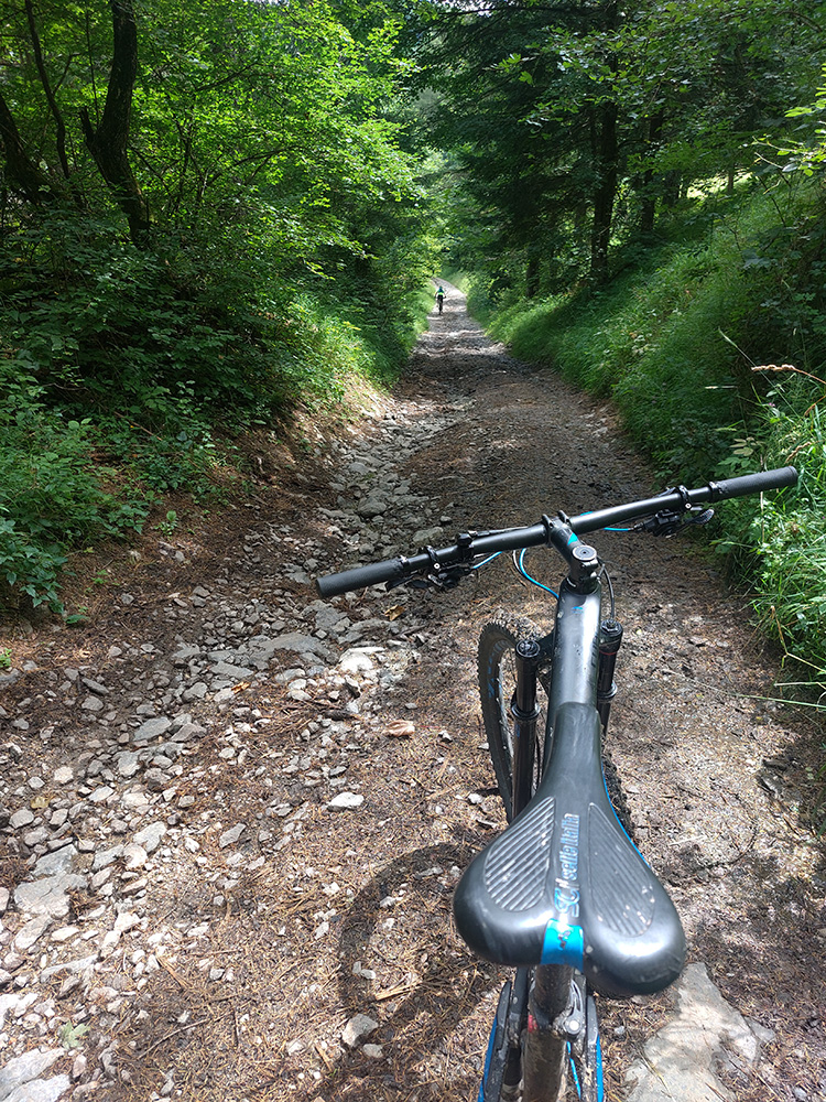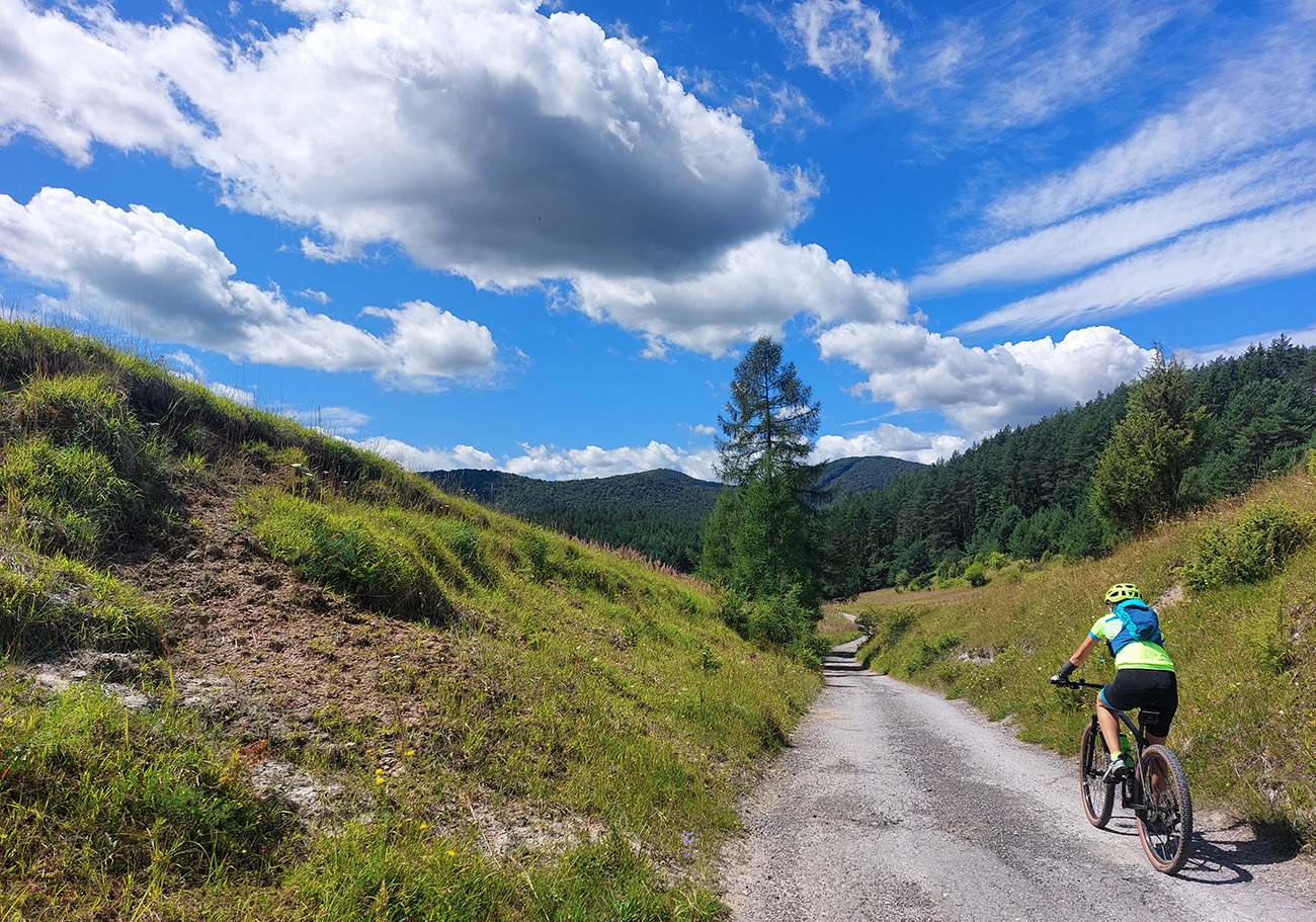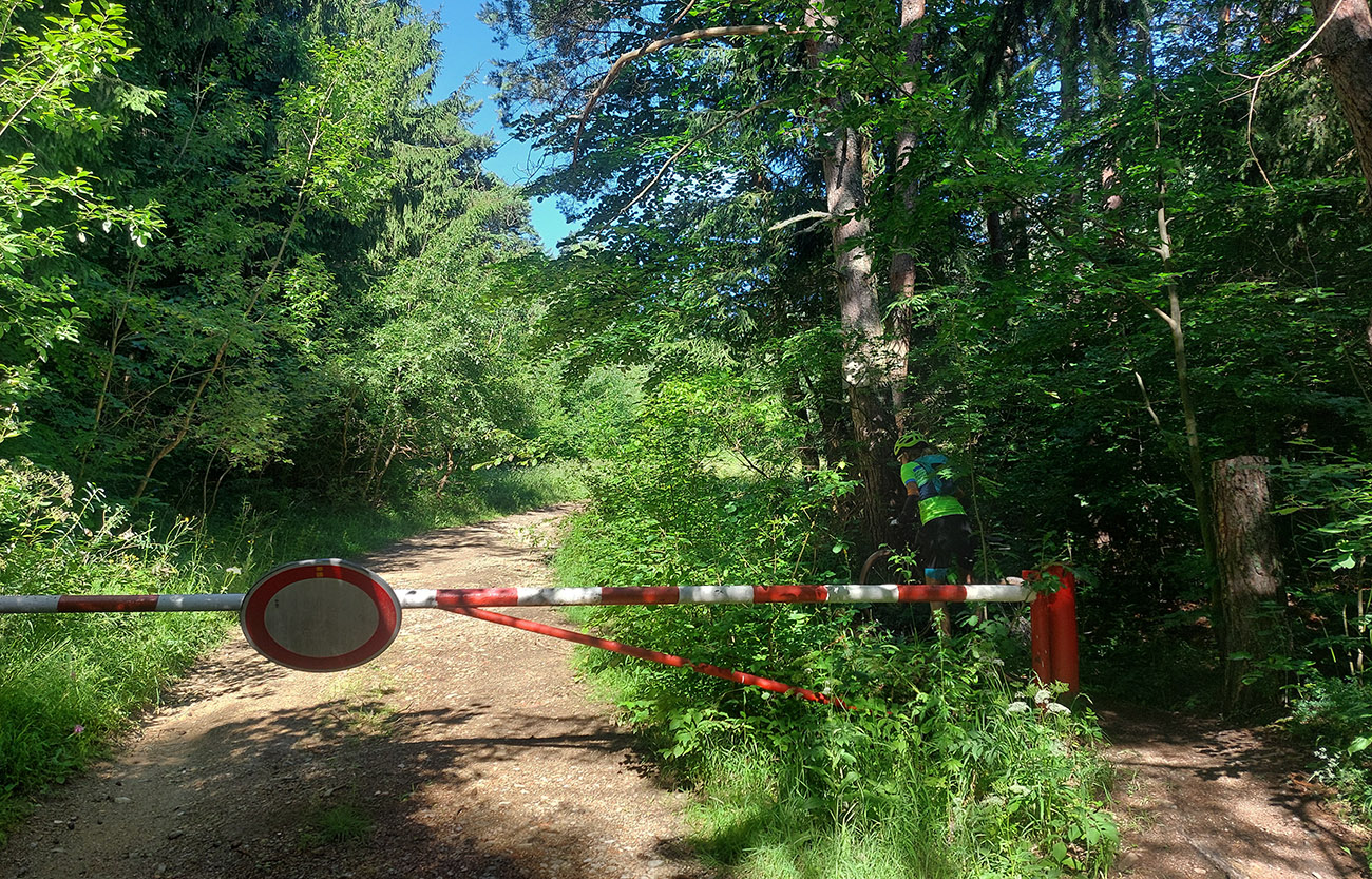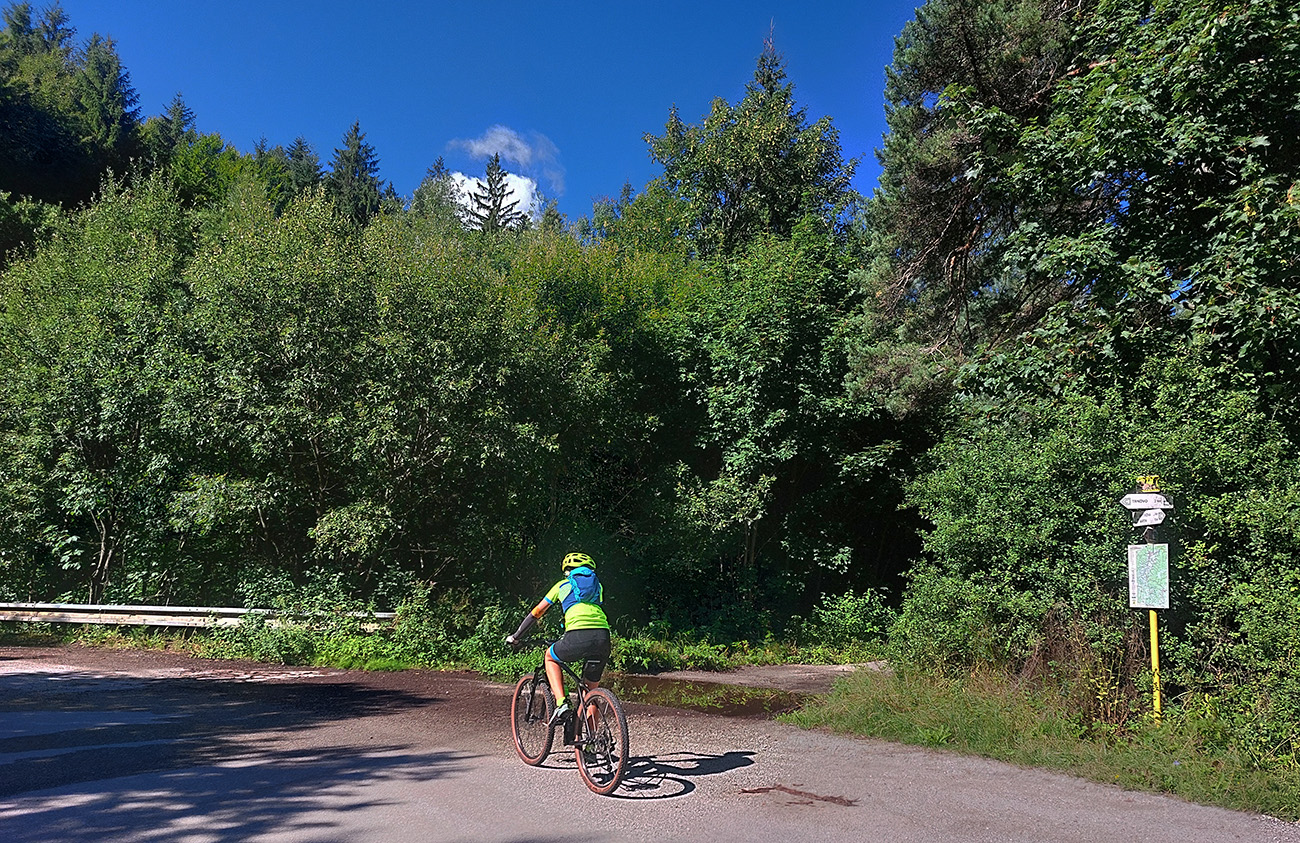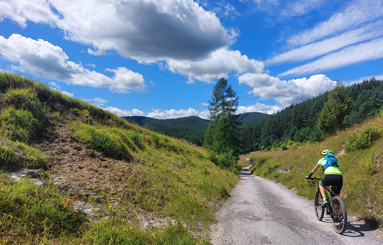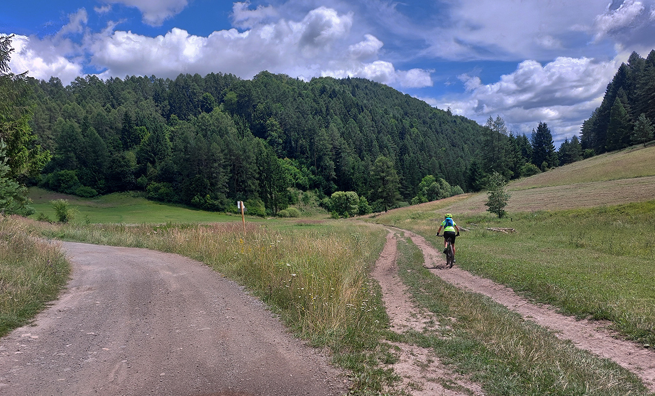 V ústí Trebostovskej doliny preč z asfaltu do lesa, serpentínou okolo muničáku a dole do Valčianskej doliny – nenáročný, nehrboľatý zjazdík, peknou bočnou dolinkou, tak pre spestrenie. Akurát po búrke čerstvá preliezka cez chodník, ale s tým sa počíta, nevadí.
