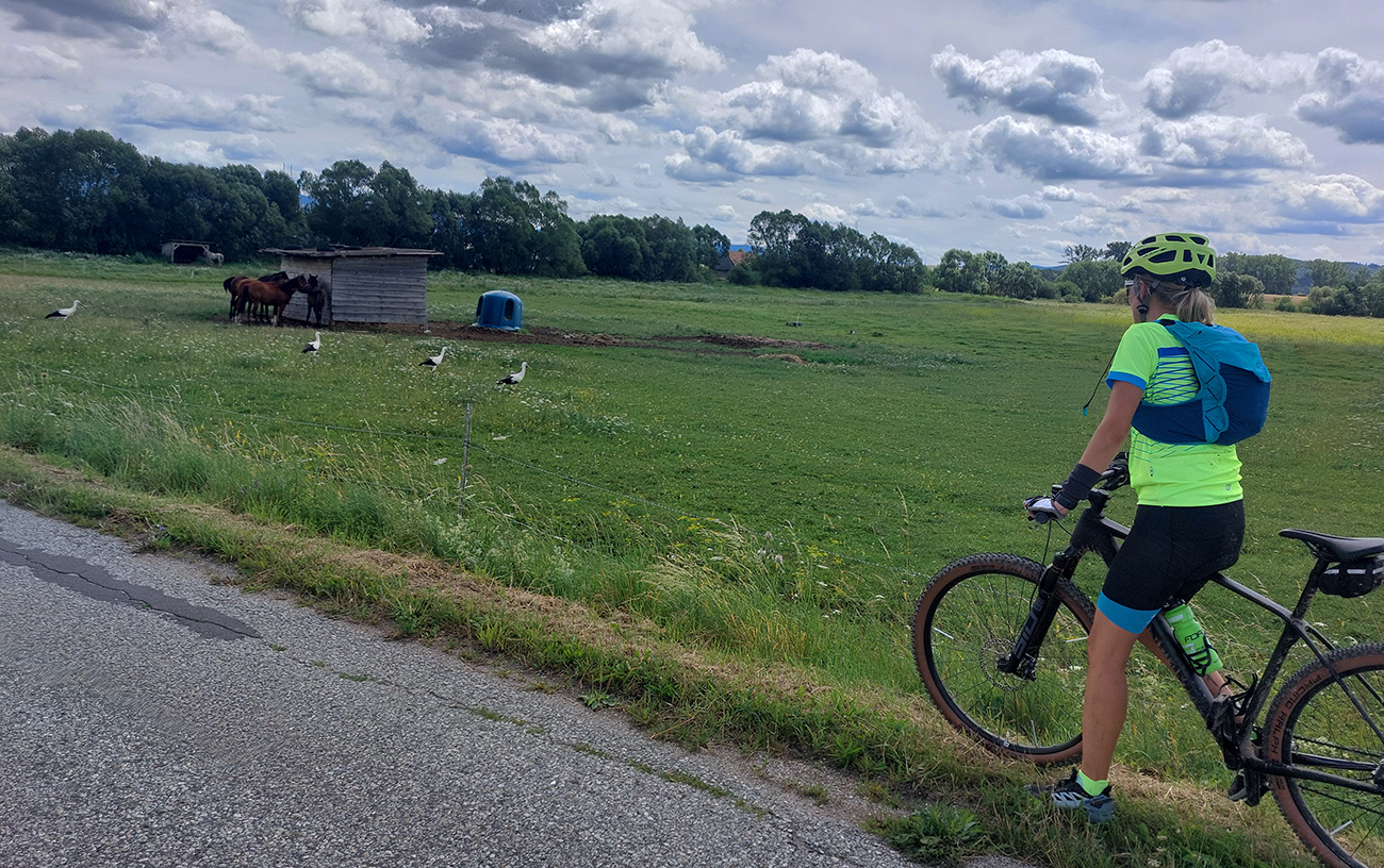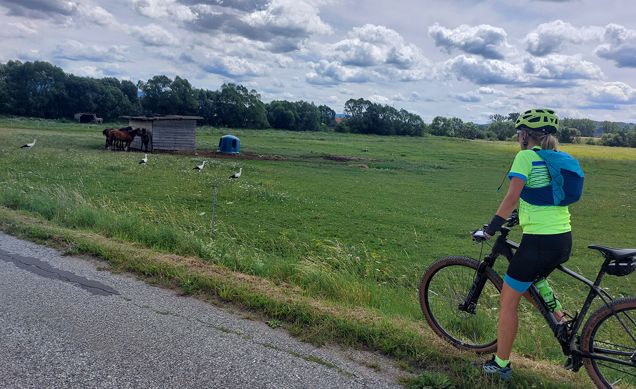 Z Hadvigy dole dolinou pomedzi mláky na hlavnú, ale tú sme opustili rýchlo. Pohlavné okresky cez Liešno a Kaľamenovú sú tiché aj v strede týždňa, tak bol priestor na obzeranie pasúcich sa zverov a motajúcich sa bocianov.