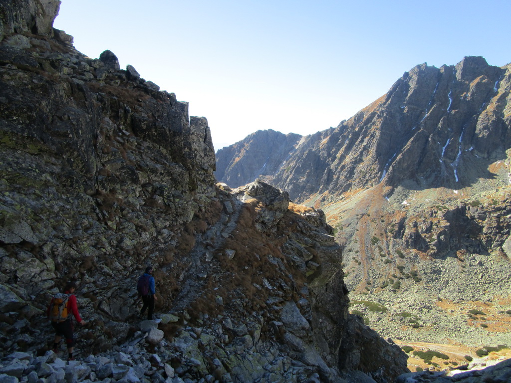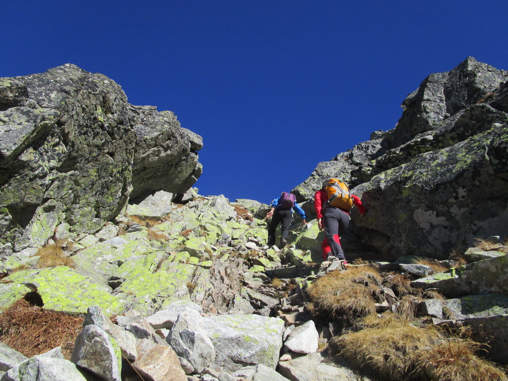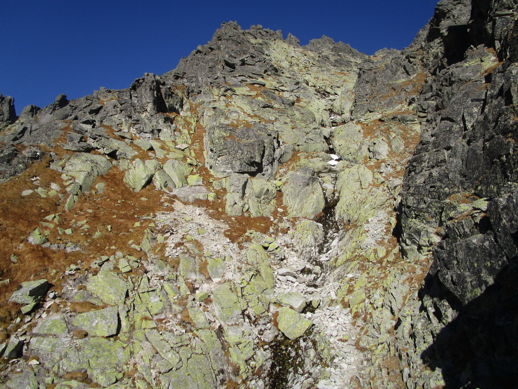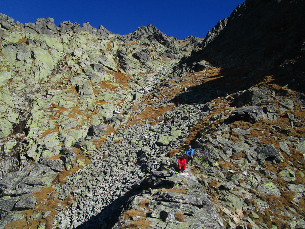 Kľúčové miesto výstupu sa nachádza na konci rampy (traverzu). Je exponované a v minulosti tu už došlo aj k fatálnym pádom... Po jeho prekonaní nasleduje už pomerne jednoduchý výstup žlabom, samozrejme v dobrých podmienkach aké sme mali my. (fotky) V tomto žlabe v zime pred pár rokmi zahynul v lavíne horský vodca s klientom...