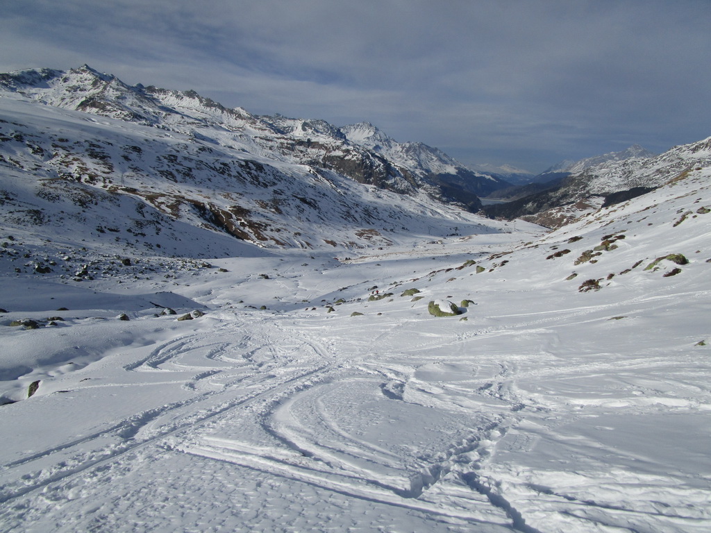 Tie však určite nepanujú v deň nášho výstupu. Po stope prichádzame do sedla. Obdivujeme výhľady na kopčeky ktorým kraľuje Lagrev, Grevasalvas, Coluonas, Piz Julier a kopec ďalších. Záver už miestami sneh vystrieda tráva, terén sa pristrmuje ale počasie aj napriek neskoršiemu času hovorí: "Choďte!"