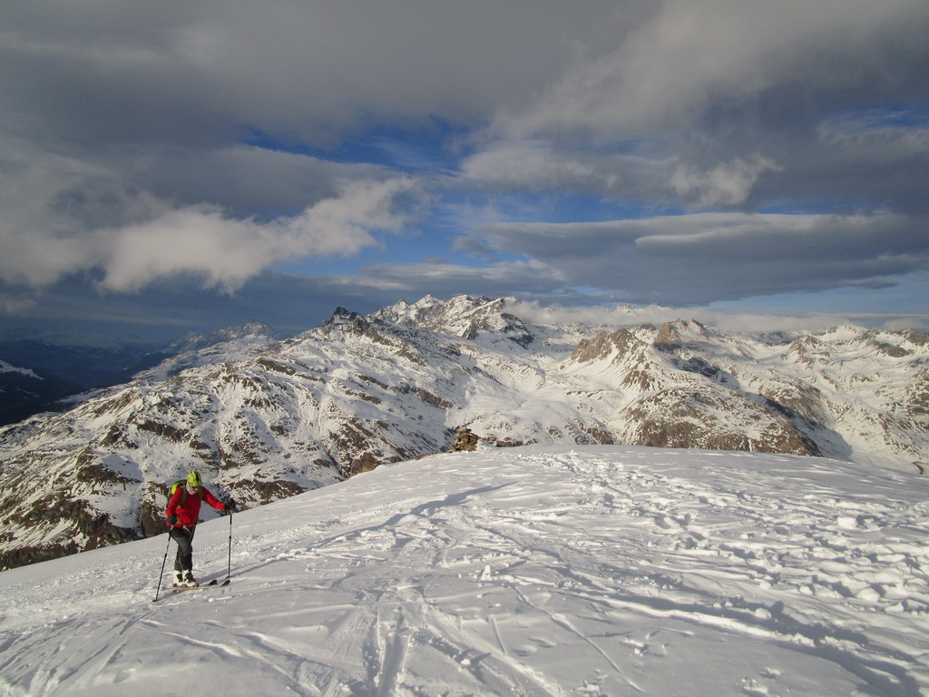 Výhľady úžasné, desiatky kopcov, niektoré aj významné, na všetky strany. Zjazd v tej kôre nestál za nič, išlo len o to zdravý dôjsť dole. Aj o tom je skialp, nie len o ujúkaní v prašane.