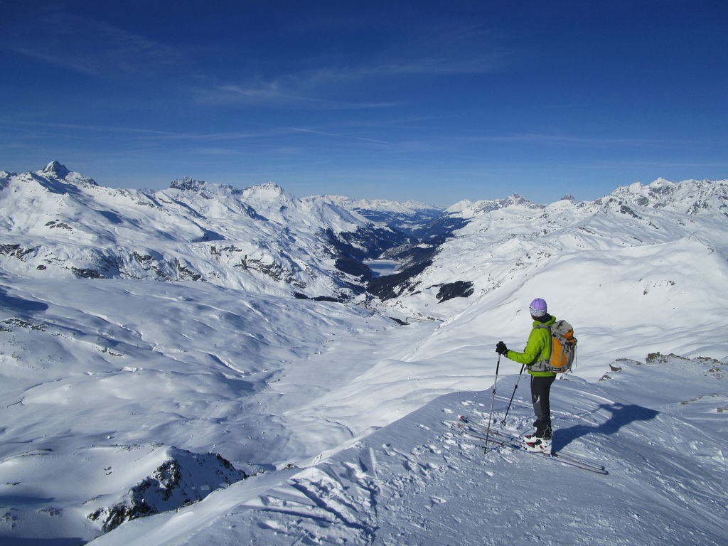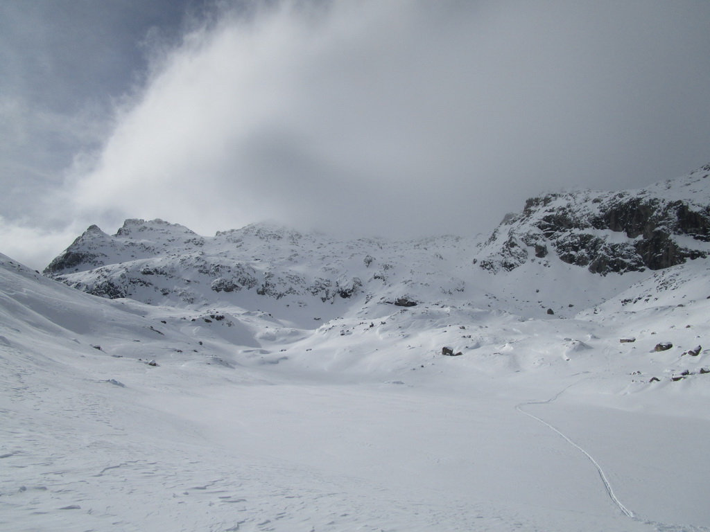 Pri návrate máme možnosť predĺžiť si túru ku sedielku smerom na Piz Lungin. Pásy nalepíme po zlyžovaní spomínaného strmého miesta a krásnou dolinkou na úpätí Grevasalvasu sa dostaneme do sedielka z ktorého je výhľad na Piz Lungin. Skialpová mapa hovorí, že by sa dalo pokračovať až na vrchol.
