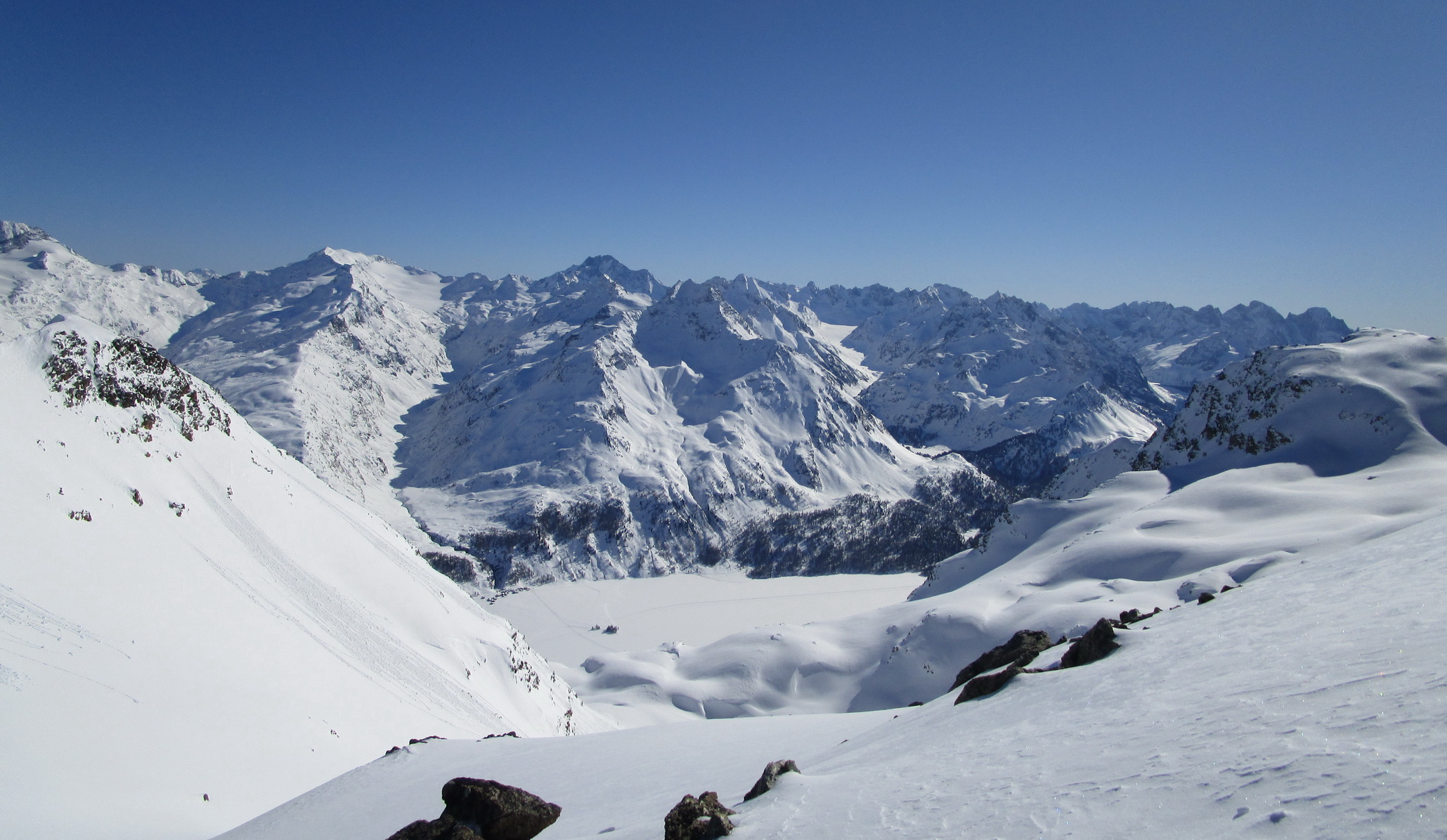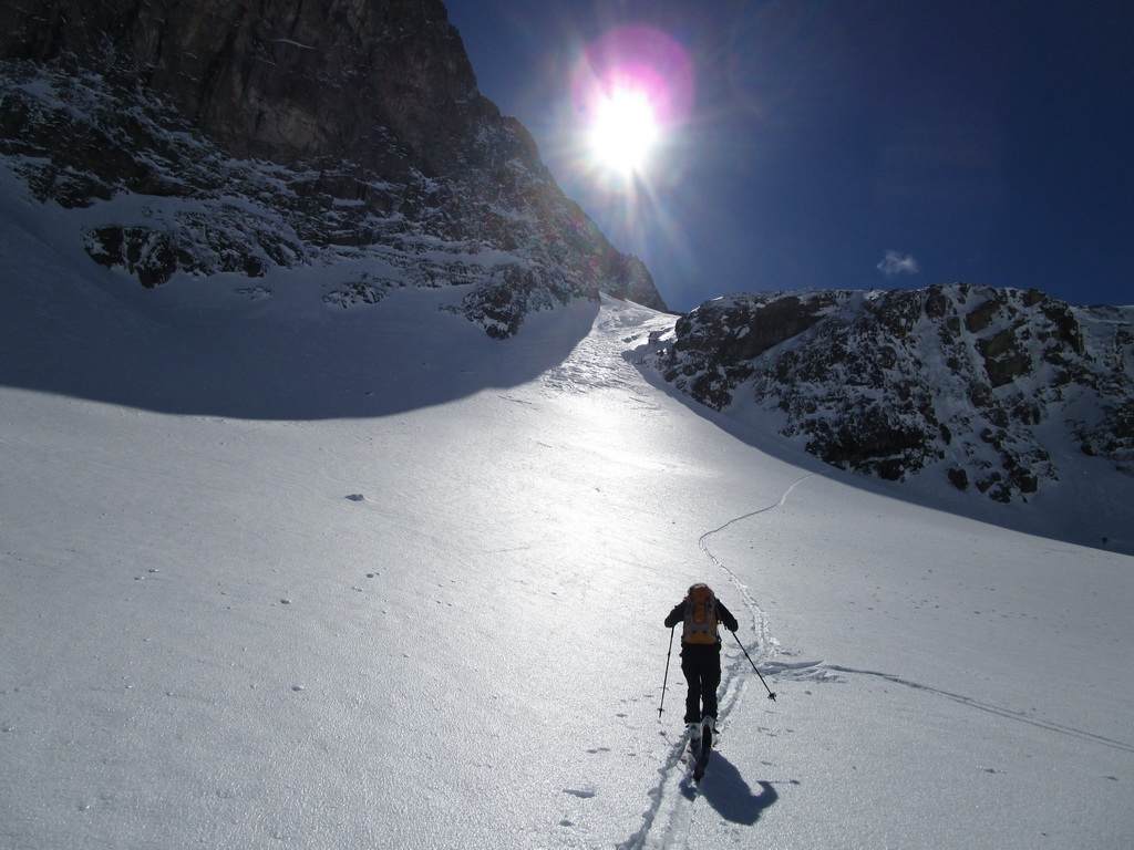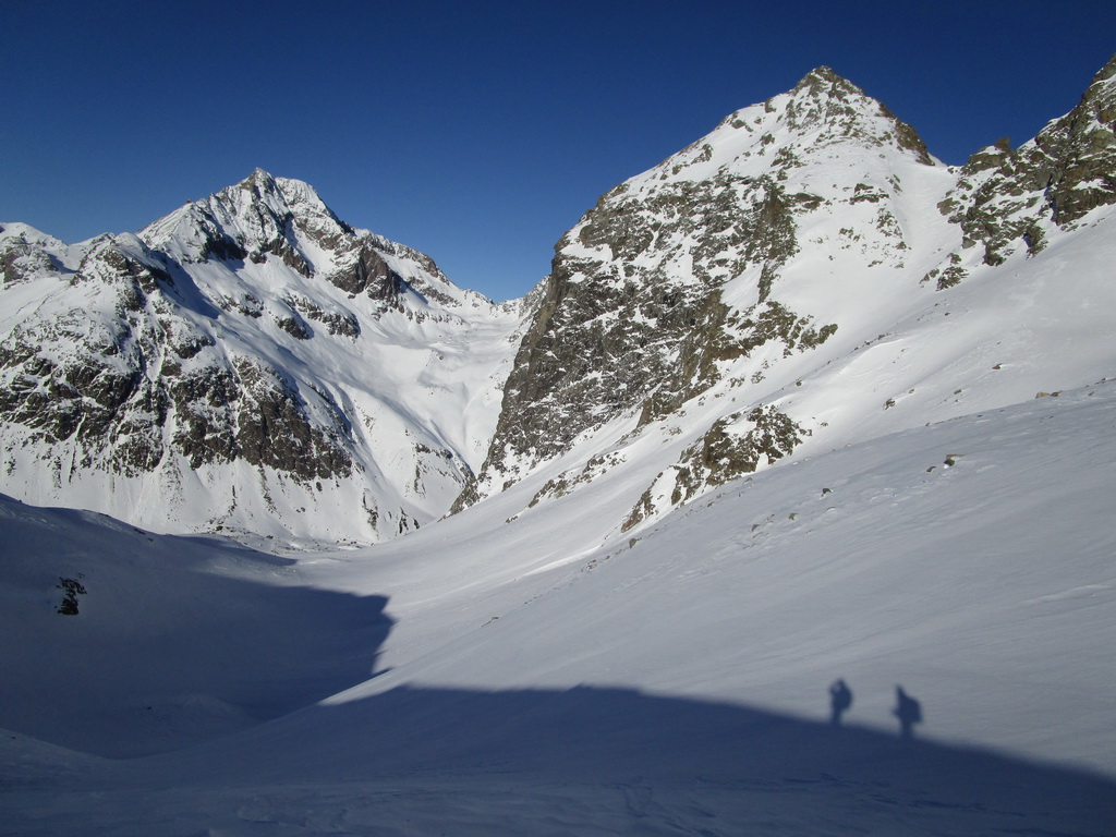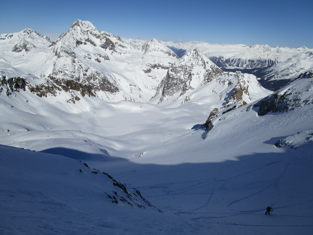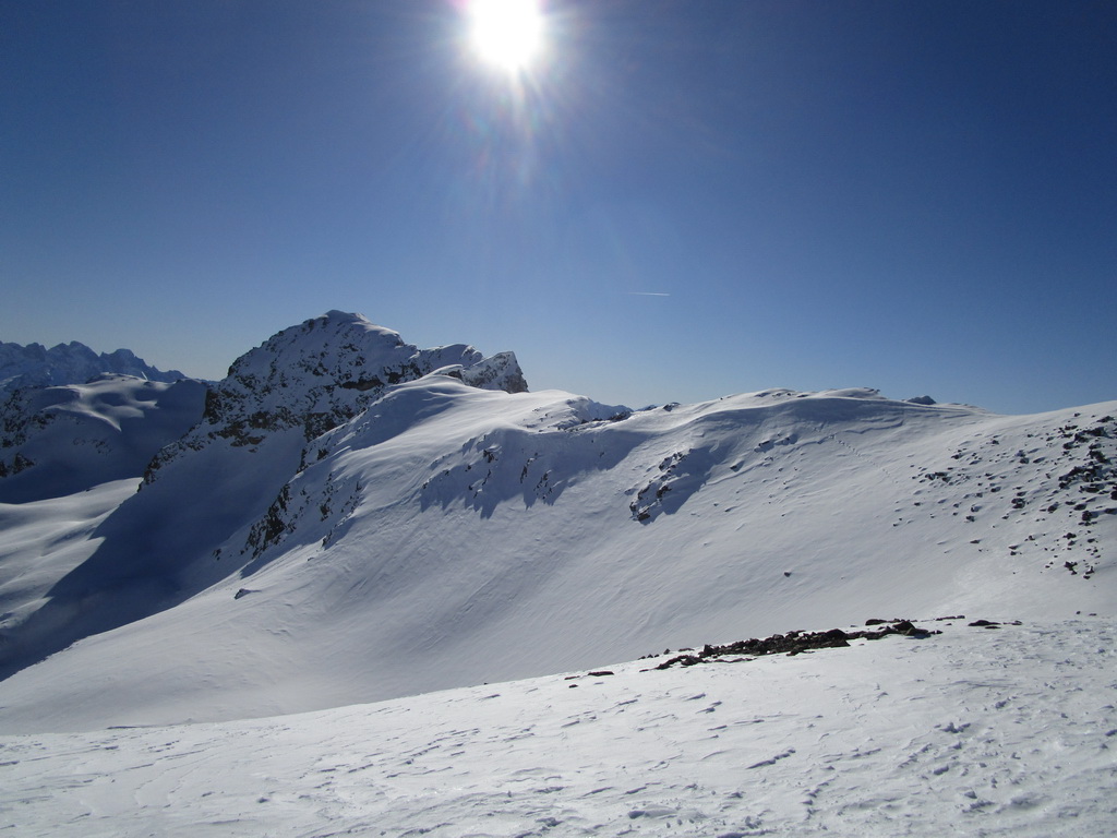 V druhej časi výstupu sa pod vrcholovým hrebeňom rozprestiera široká pláň. Pre lyžiarov je to veľa možností a tak aj pri ich väčšom množstve si stále nájdete miesto pre svoju stopu. Výstupová dolinka s nasledujúcim kotlom ponúka aj alterantívne možnosti ktoré sú ale veľmi málo využívané. Pod článkom si nájdete aj odklik na túru s výstupmi na Polaschin a Coluonas v kombinácii s lyž. vrcholom Lagrevu.
