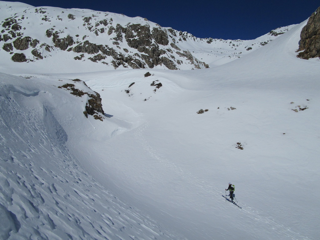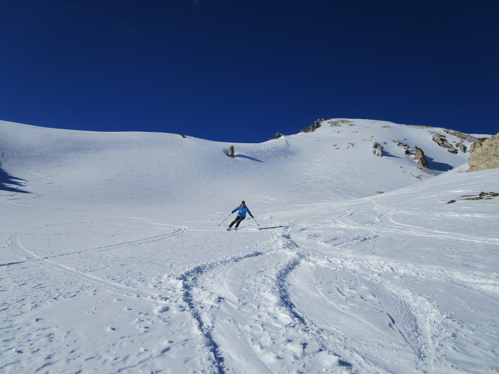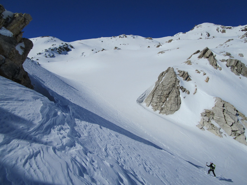 Vo vrcholovej partii sa môže v prípade tvrdého firnu vyskytnúť potreba mačiek. V ideálnych podmienkach sa dá lyžovať priamo z vrcholu.