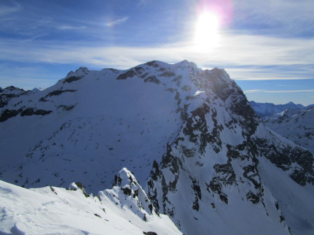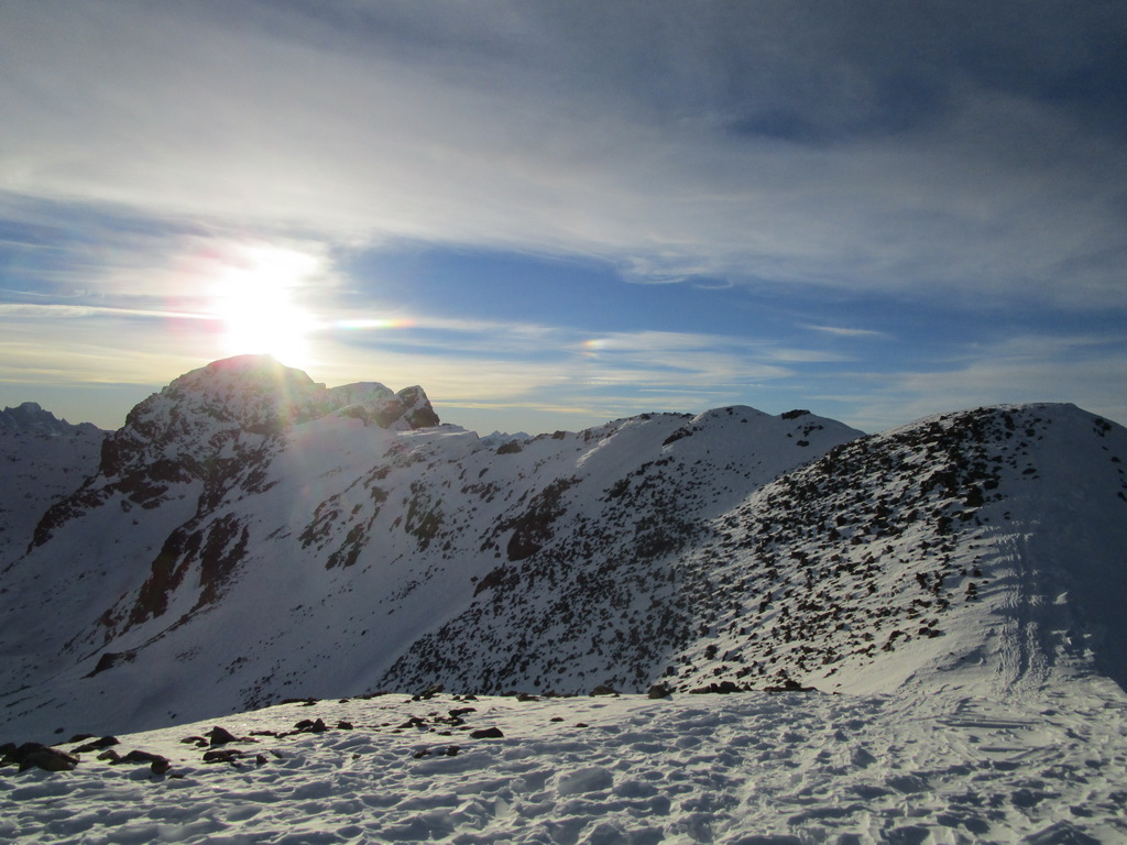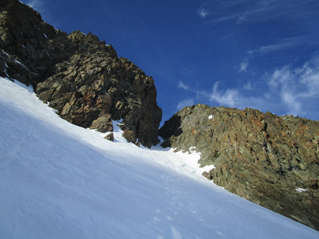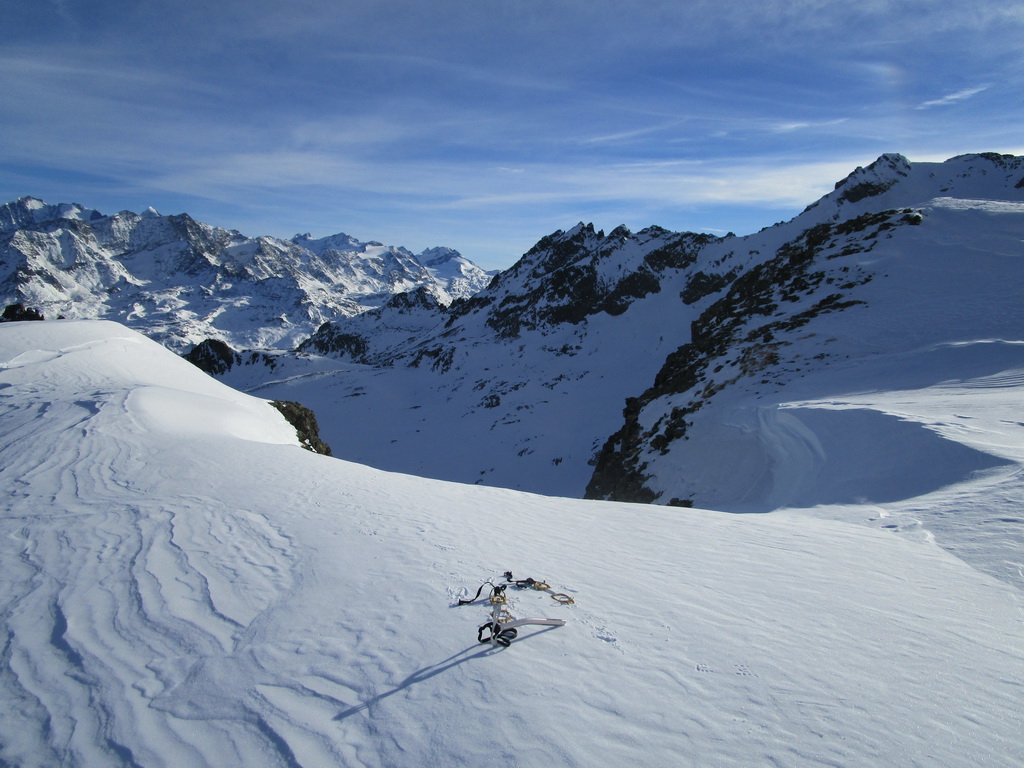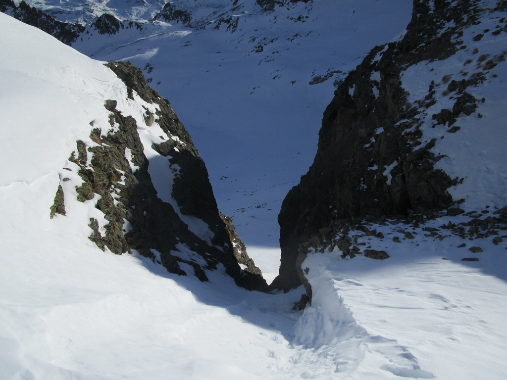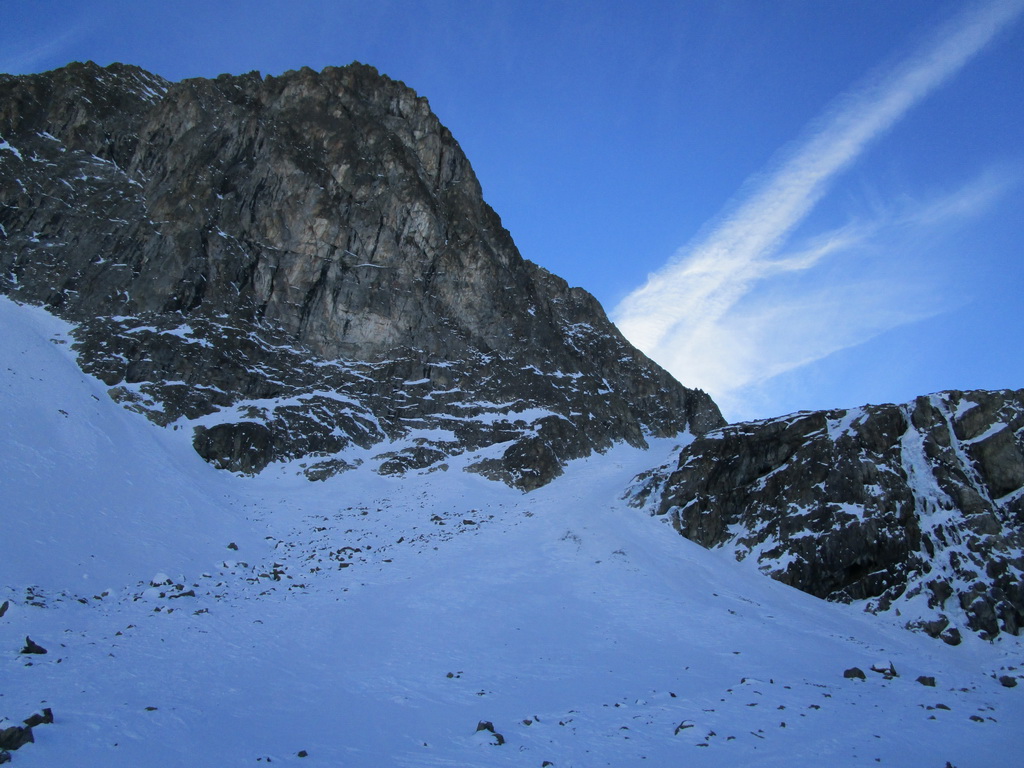 V strmom svahu popri ľadopáde používam haršajzne. Na plošine nad ľadopádom odbočujem z klasickej výstupovej trasy doľava. Stúpam hore žlabom. Neskôr už na mačkách. Ešte pod sedielkom nechávam lyže. Ďalej už naľahko. Skalný hrebienok leziem v skeletoch aby som zistil, že tadiaľto to nepôjde. Zliezam naspäť. Vraciam sa kúsok po mačky. Traverzujem a o chvíľu som hore.